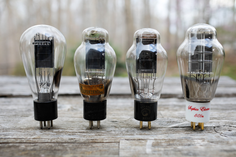 A representative selection of Type 50 tubes: RCA/Cunningham globes from 1928-31 or so, Silvertone ST from the 1930’s, modern production Psvane ST50 and Sophia’s “mesh” plate 50. I bet no one back in the early days could have ever guessed that the 50 tube would be put back into production in the 2000’s! |