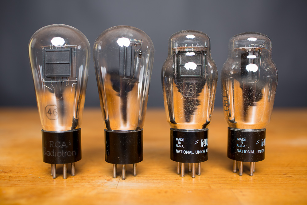 46. The 46 is a strange tube, a “dual grid power amplifier tube” that is actually meant to be run as a triode, this tube was made for industrial amplification in a same-drives-same configuration, almost like a Sakuma design. Used this way the 46 in push pull could make 20 watts of low distortion Class B power. 90 years later its finally found favor in the hifi community, who have recognized it's flat out amazing sound in single ended applications. What a good thing that this tube was “rediscovered”! This one dates to 1932 or so. Tube data for the 46 can be found here.