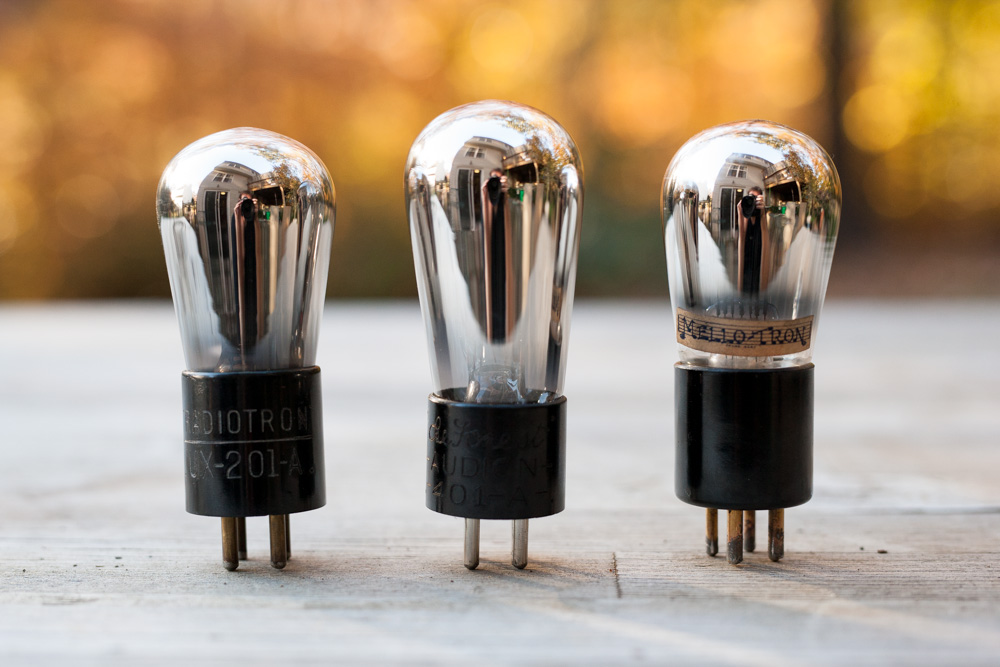 UX-201/301/401. The UX201 is one of the very first tubes ever marketed by RCA, coming online in 1925 and having the new UX four pin base. This is an incredible tube that has a detailed and warm sound boosted by the thorium tungsten filament. These were made in great number in only a few years and appeared in early radios. They’ve found new use in hifi preamplifiers and in such role they are very special. These tubes do tend to be microphonic and care must be taken to physically isolate them. They are worth the trouble though, and are one of the finest sounding tubes ever made. Tube data for the UX201 can be found here.