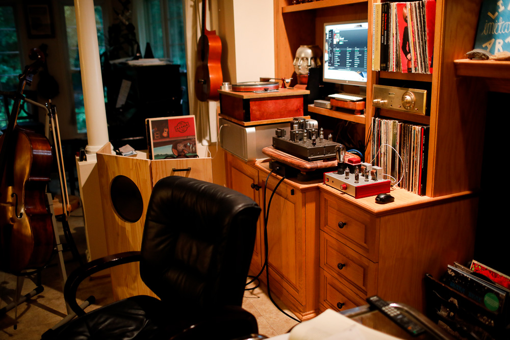 Here it is in my living room system; its diminutive "almost 1 watt" pushing out music through my Zenith baffles in a pretty good-sized room. It sounds great; full and live at a real-world conversational volume. With the attenuator all the way to 11 this little amp makes it loud enough to be hard to talk over, and its still clean at its 100% mark. This is a very nice alternative to the EL84 push pull sound I've grown so fond of in this space. |