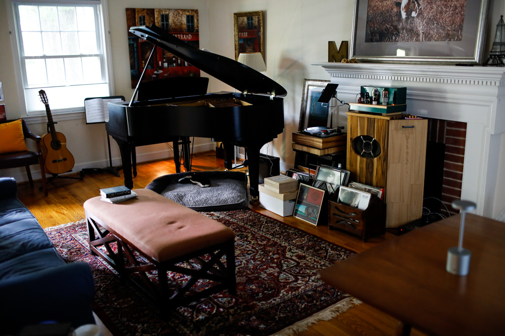 Nice and simple. Mono is a great choice for a room or space like this. Here I’ve repurposed my folding baffle with a nice teak front and a cutting board top that supports the amplifier. Attached to the inside wing is a compact Bellari preamp that I used with the McIntosh amp, and as a phono preamp. I thought of it as a kind of open baffle juke box. |