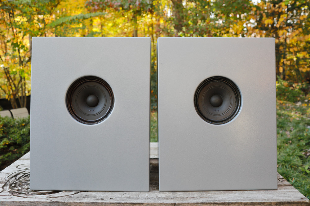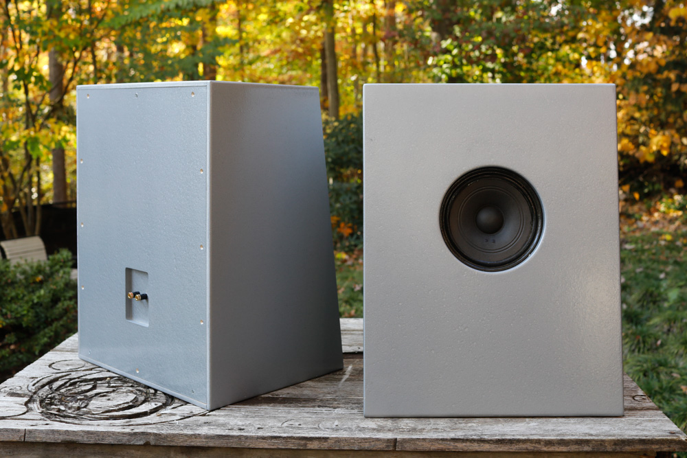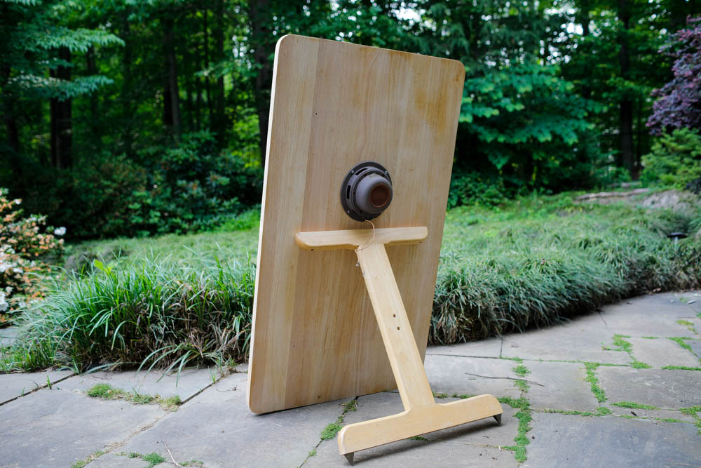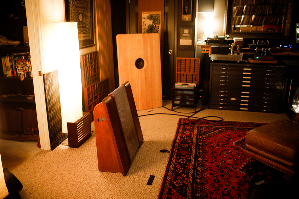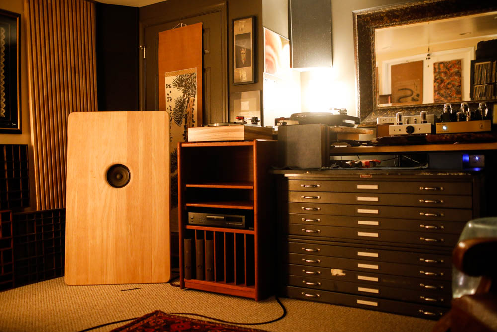 Here is the driver in an Altec 618 cabinet clone. This is a standard application for this driver, but I found it inferior to the open baffle sound of the Telefunken cabinet or the simple maple butcher block. |