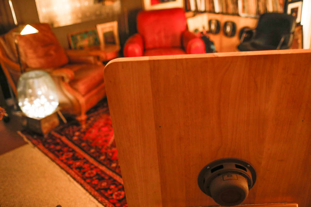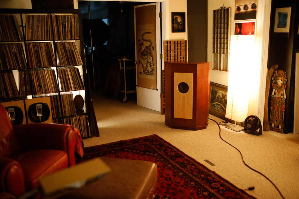 This baffle is made from a 1.5 inch thick maple butcher block table, with the driver rear mounted and using one of the table’s legs as the back brace, which allows for a lot of adjustability in the angle of engagement. Corner placement as seen a few photos below seems to help project a larger, richer soundstage, much like with the huge ElectroVoice Georgian horn in the opposite corner. Although I do prefer the 755a in the Telefunken cabinet, the corner baffle is more convenient for the 15 or 20% of the time that I now spend on mono playback. It’s not perfect, but I do like this setup far more than anything I could achieve with the Altec 618 cabinet. |