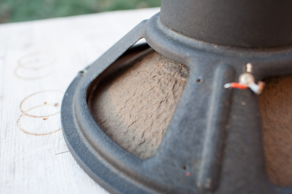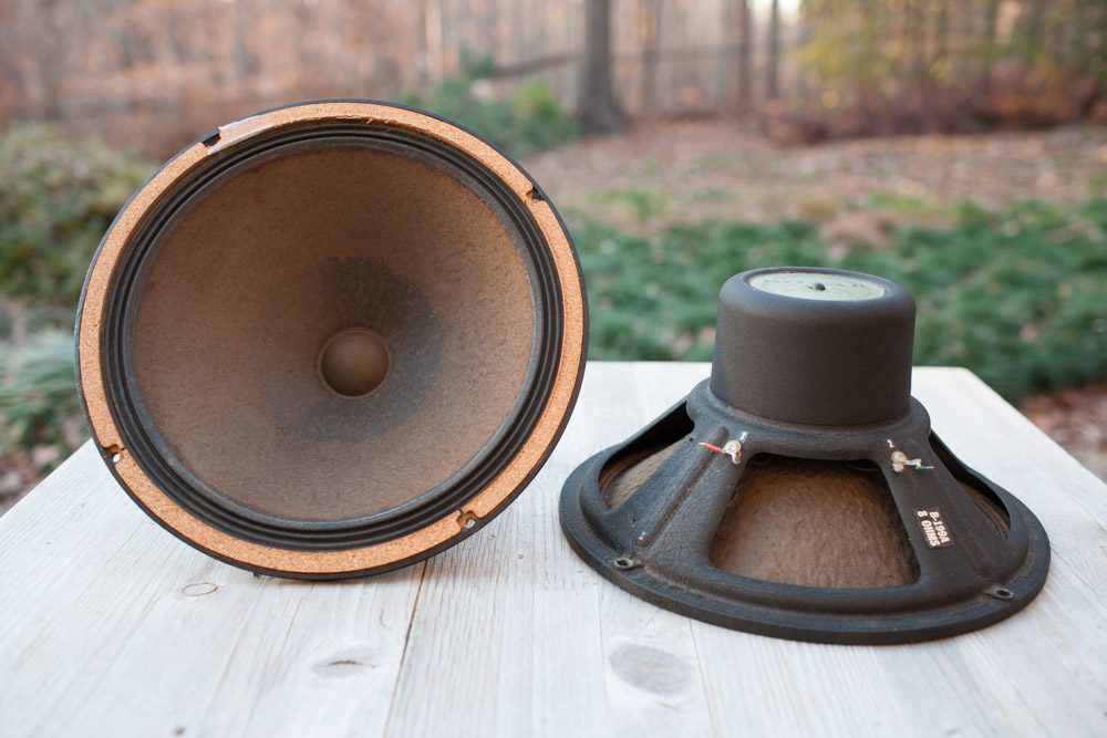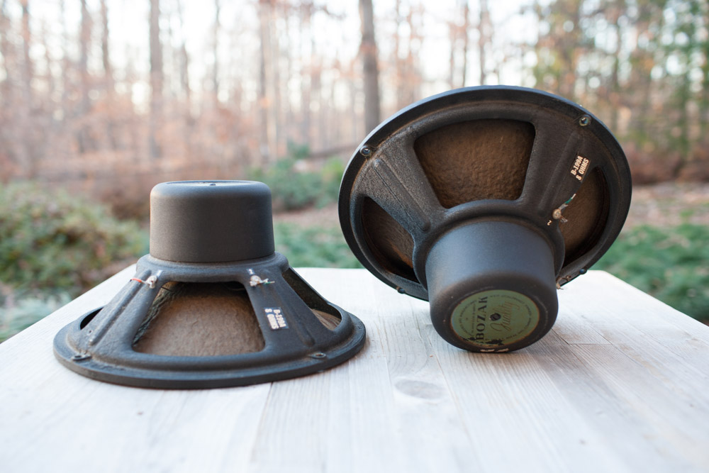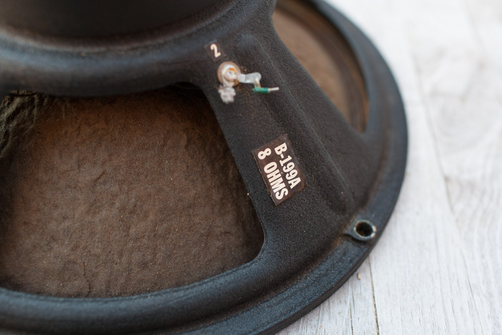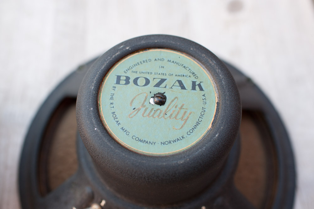 | Bozak B199a The Bozak B199a woofer dates to the early 1960’s. The pair below came with the typical tweeter array mounted on a frame that extended across the big 12-inch driver, making this a coaxial speaker. It was likely loaded in a large infinite baffle enclosure, where it stayed for 4o+ years. This 12 inch driver is an excellent speaker. Robust and extremely well made, with a super heavy hemp cone and an alnico magnet. The cone material here is a Rudy Bozak secret, and of great interest. It seems to have inspired (or been inspired by) some of the cone material you see in the superb quality 60’s Japanese drivers from Pioneer, etc. Smooth on one side but rough and sinewy on the rear. The tweeters this came with however were not so great. Liberated from those, this driver is capable of portraying a very realistic soundscape, with deep and rich bass and a wonderful full tonality. While not terribly efficient, it does play fine with the larger single ended amp, say 5-6 or more watts per channel, making it a good match for 300B amps. Paired with an appropriate tweeter, it can make a very good open baffle speaker system, and I have read positive comments online about these in direct comparison to some very rare 50’s Western Electric/Altec drivers. These are definitely worth a look. | ||||||||