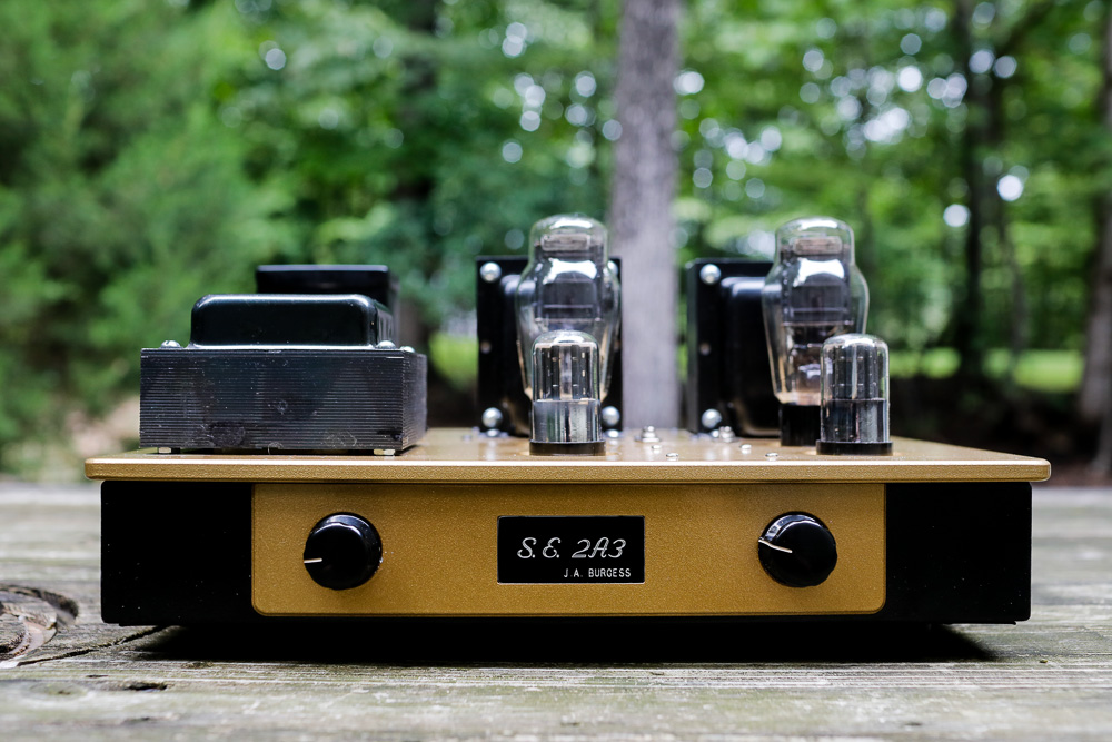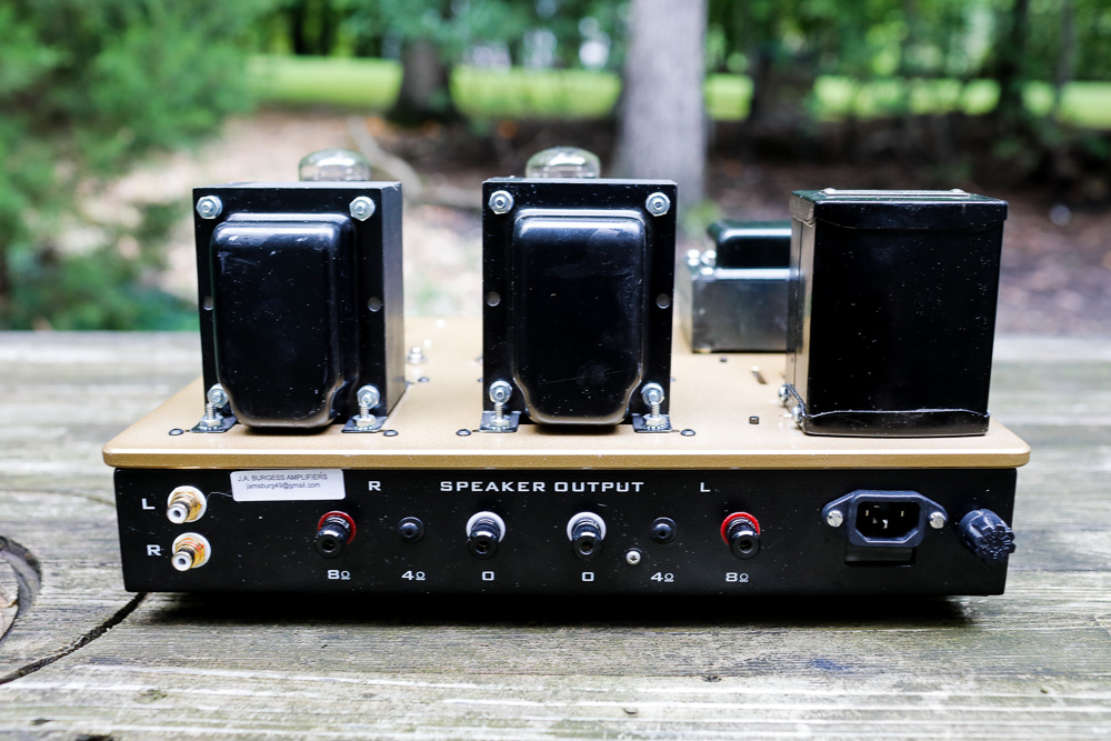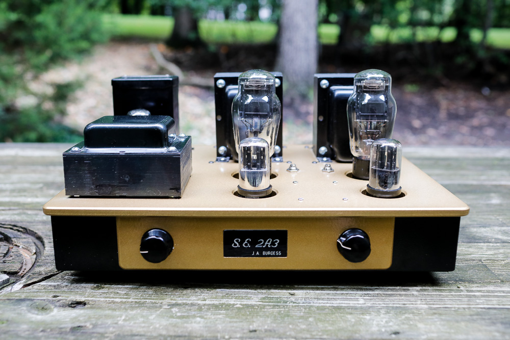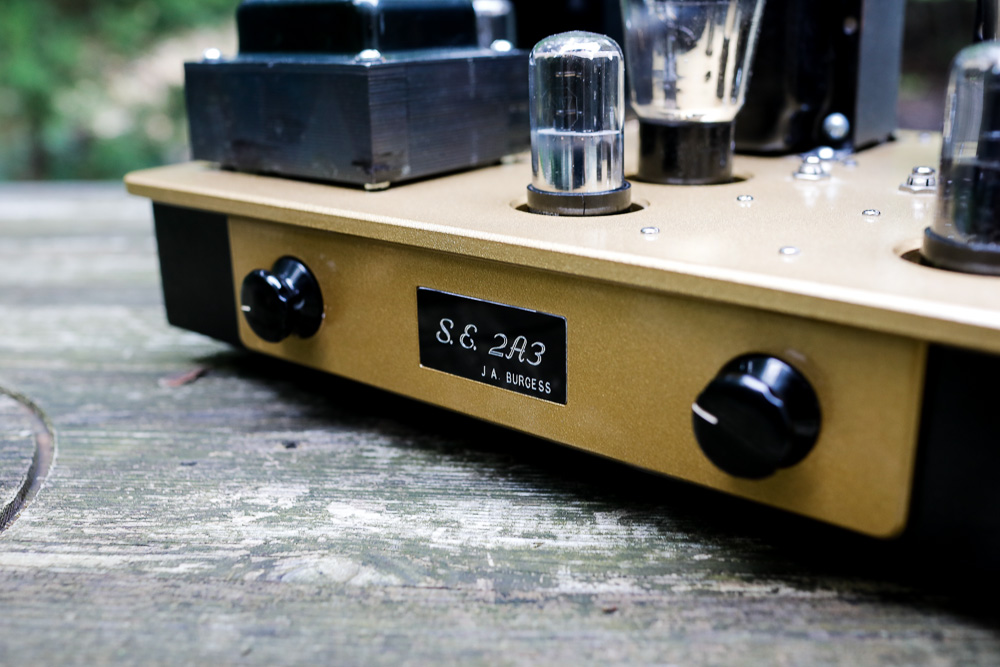 James Burgess Single Ended 2A3 James Burgess is a name that you’ve certainly heard a time or two if you’ve been interested in single ended amplification for any length of time. A Jeweler by trade, Mr. Burgess has a reputation for very clean and professional amp builds using many of the old favorite Triodes, like the 2A3 and the 45, and he is one of the few I’ve seen who has ventured out and built the 71A. I’ve been watching Burgess amps come and go for years but never at a time when I was ready to buy, until now. Eventually the Universe always provides! Here we have a beautiful James Burgess Single Ended 2A3 amplifier. This is certainly one of the most well executed amplifiers I have owned so far. Very elegant, and while still an industrial beauty with exposed transformers and top mounted screw heads, this amp has a high-end feel that goes beyond the muted gold top plate and recessed tube sockets. This is a massively solid amplifier, and picking it up it feels like a brick of gold. The output transformers are robust, large units and the vintage General Electric choke is a nice touch. All connections are rear mounted for a clean presentation and the front panel has an on/off switch and a built in volume control. All in all this is a model of functionality in an elegantly understated package. 10 out of 10. The fidelity of this amp is also very good, and it has all of the open warmth that I have come to expect from the 2A3; a small topping of romantic overtone spread out on a clean and clear platform. This amplifier presents a very wide but focused image, with a huge presence. It approaches the Will Vincent 801a in this regard, and feels a little more driven and turned up than the Yamamoto A-011. The 2A3 is one of the best sounding tubes of all time, and it really shines here in the Burgess amplifier. The 6SN7 inputs allow a lot of choice in tailoring the sound to individual taste, and I’ve been having a nice time with a pair of British CV1988 tubes. In the 2A3 slot I’ve found the big JJ 2A3-40 to be a good choice as well as the single plate Triad tubes, which never disappoint. Of special note, this is an exceptionally quiet amplifier at idle, with basically no noise at all unless your ear is right on the speaker cone and even then it is almost silent. Well done! Mr. Burgess certainly deserves accolades for his amazingly well crafted amplifiers, and I'm very pleased to finally own one of his hand made creations. More of his work can be seen on his facebook page here. They don't get better than this. Highly recommended! |