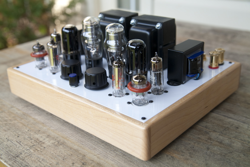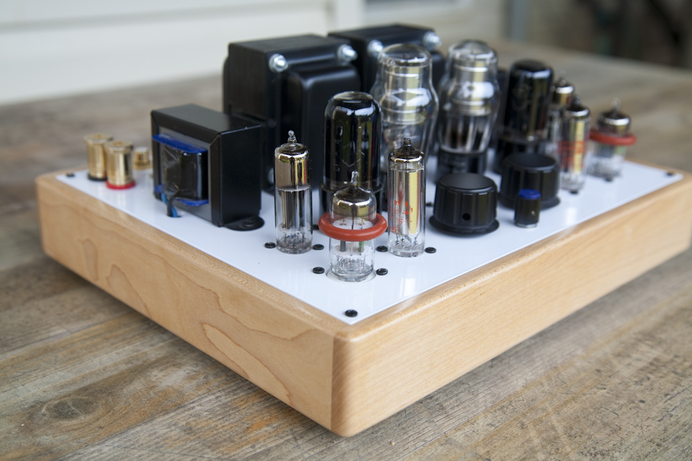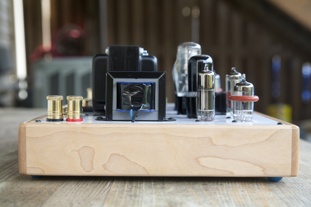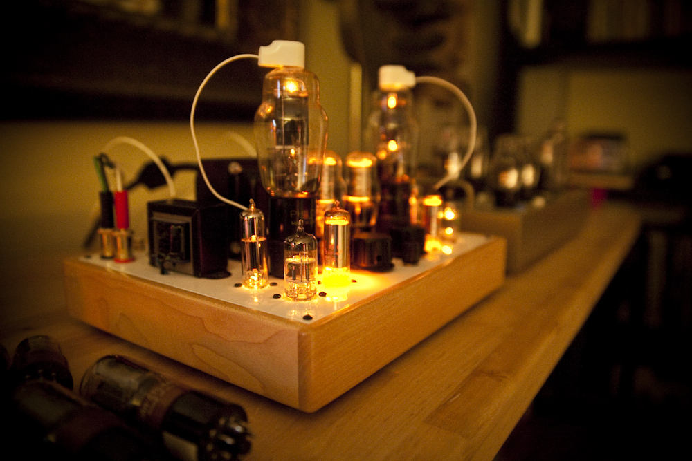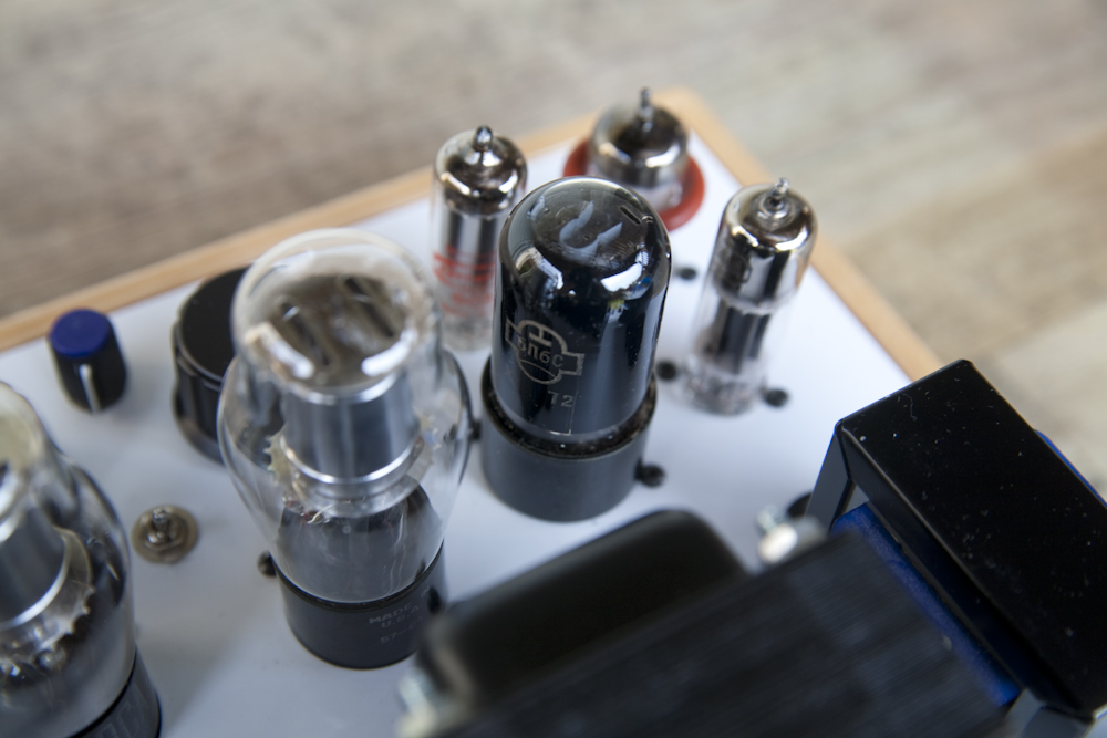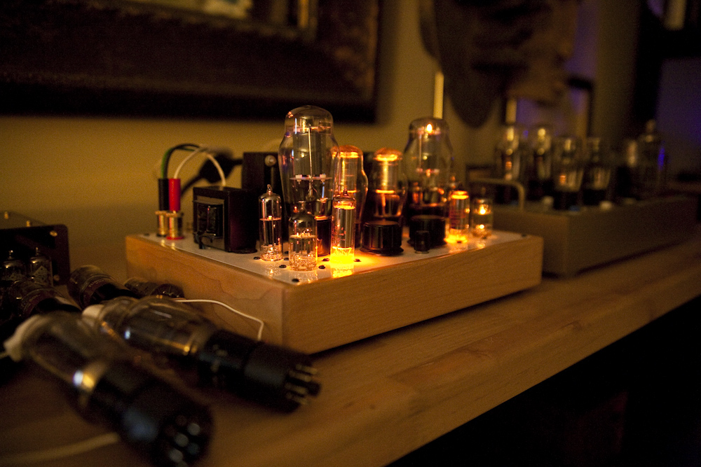 Using adapters, the Mini Torii can take a wide range of cheap, easy to source and very good sounding tubes. Here it is pictured running a pair of Sylvania 5933. Beside the amp is a pile of 807 tubes, which use the same adapter as the 5933 "super tubes". Great vintage American 807 tubes, like the 6BG6, can be had for a few dollars each. I bought 10 pairs for $45. |
