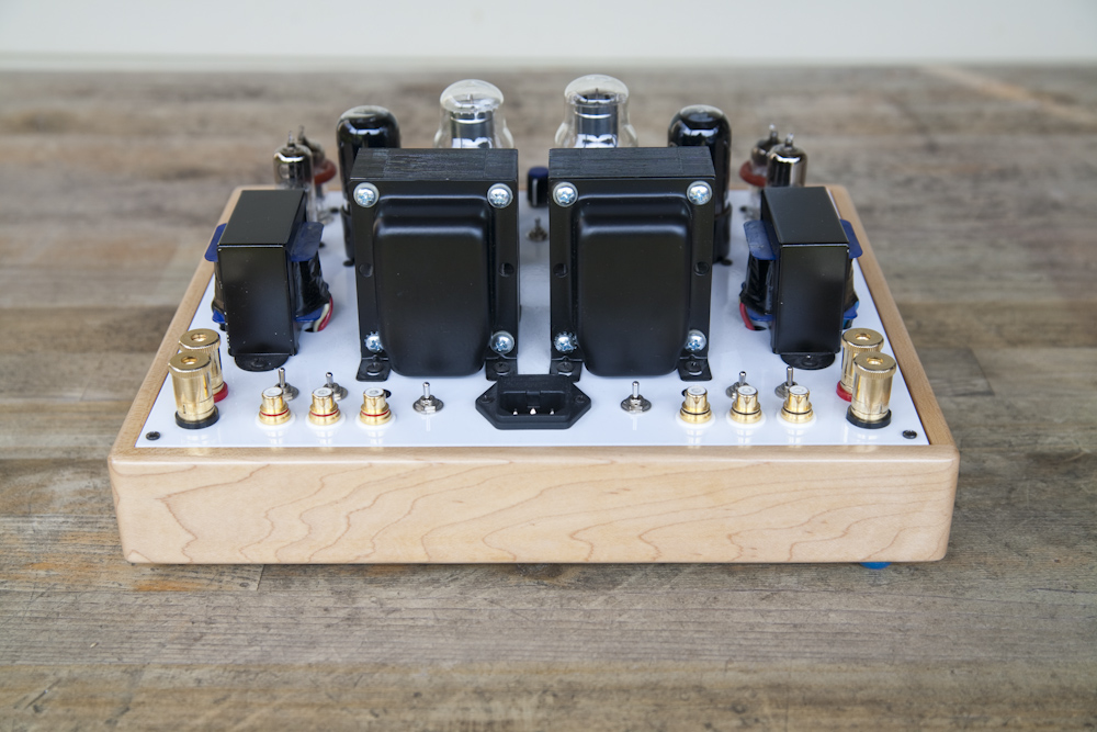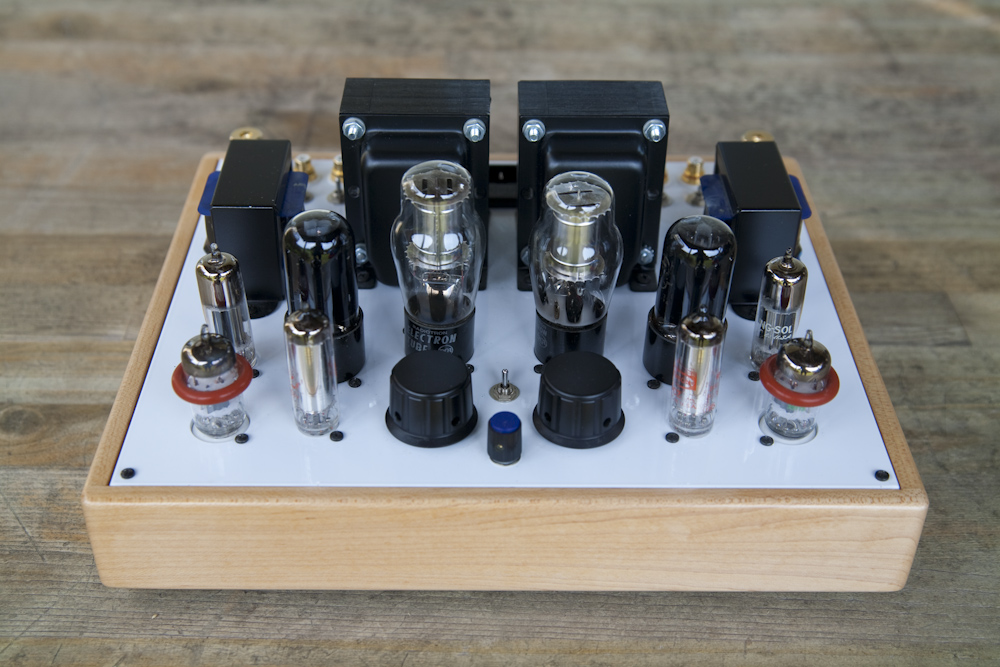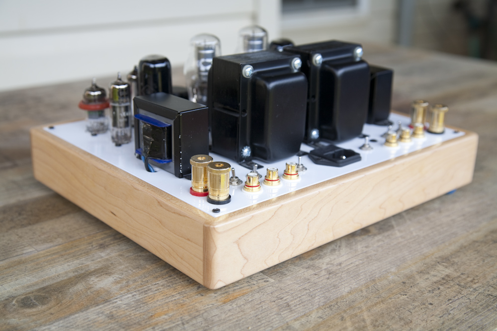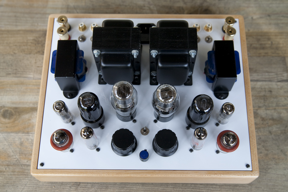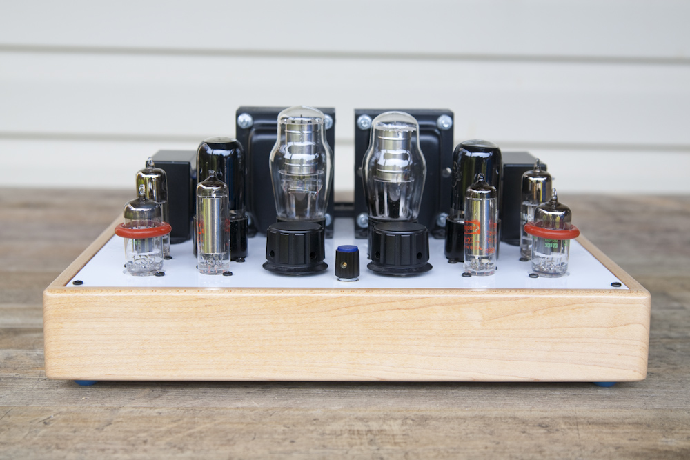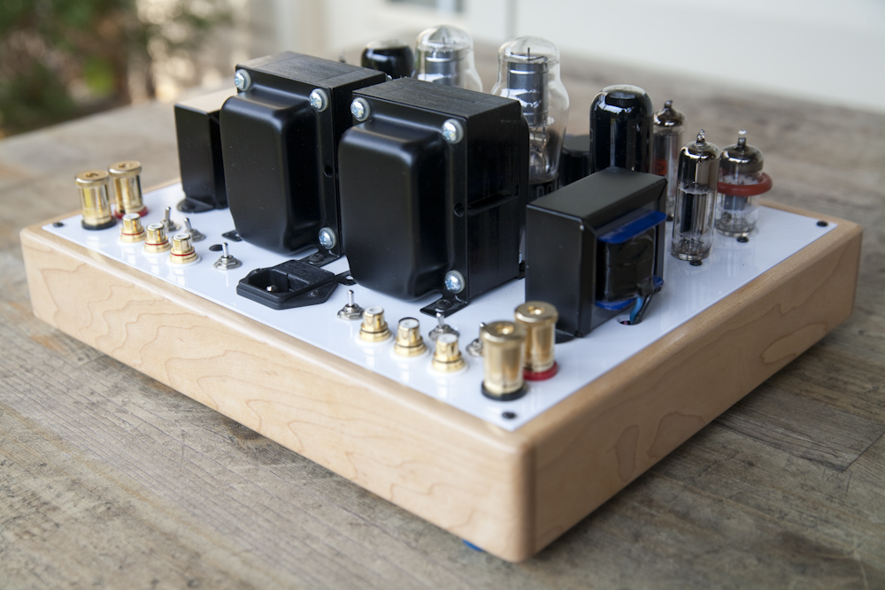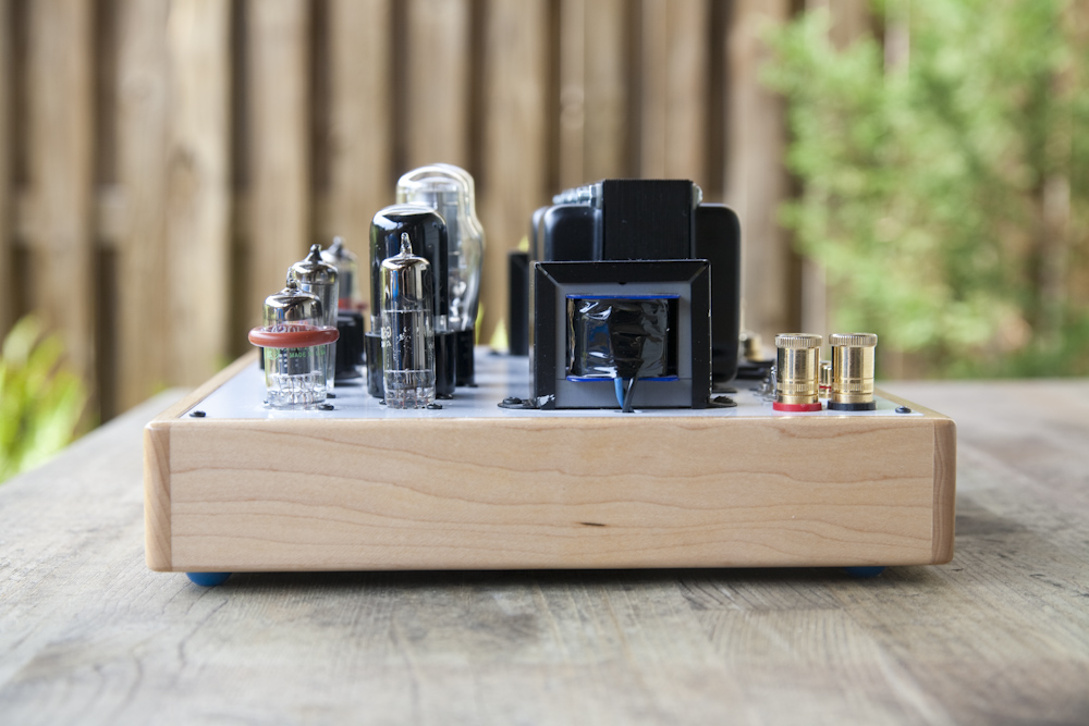 Using adapters, the Mini Torii can take a wide range of cheap, easy to source and very good sounding tubes. Here it is pictured running a pair of Sylvania 5933. Beside the amp is a pile of 807 tubes, which use the same adapter as the 5933 "super tubes". Great vintage American 807 tubes, like the 6BG6, can be had for a few dollars each. I bought 10 pairs for $45. |