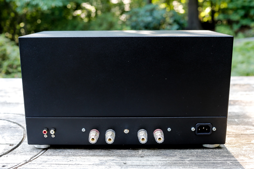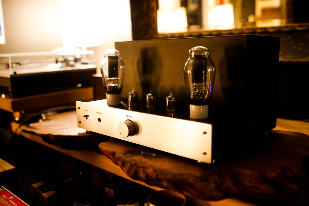 Overall, a very clean looking amplifier. Tubes are 300B driven by two stages, with a pair of 12AU7 and a 12AX7, here by Sovtek, RCA and Telefunken respectively. |