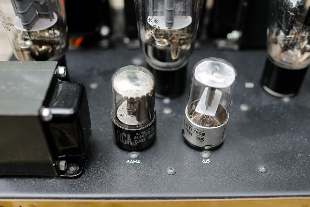 The preamp and phase splitter. I’m guessing the 6J5 is the preamp tube, and what a sweet choice this is. The 6J5 is half of a 6SN7 (and only half is needed in these monoblocks), and these early versions of the 6J5 probably date to the WW2 era. The 6SN7 family of this vintage, (and especially with metal collars) demand very high prices now (and in this circuit one side of the tube would be unused and wasted). The 6J5 is still reasonably priced and is an equally spectacular sounding tube type. |