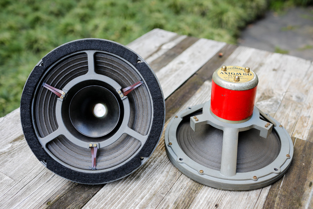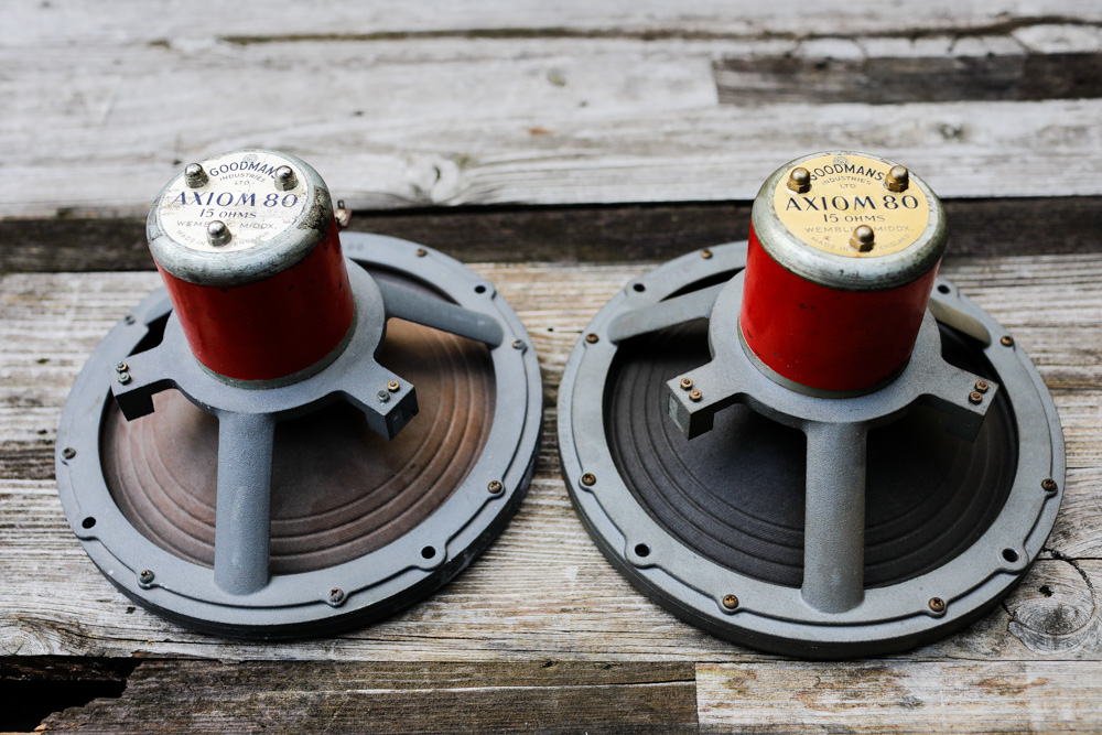 Goodmans Axiom 80 Goodmans is a British company of yesteryear well known for exceptional sounding drivers of superbly quality. Beginning in the 20’s, Goodmans production spanned the rest of the 20th century. But of all their models of drivers and speakers over the years, none is more famous than the Axiom 80, shown below. A legendary driver, the Axiom 80 has an anecdotal reputation for sounding very clear and for being “the best”. Its expense and relative rarity only add to the legend. It's a driver unlike any other, and although many have heard of it, few have actually heard it. I’ve been searching for a clean pair of Wembley-made Axiom 80 drivers for years now. They are often available from eBay Japan with lofty price tags, but aren’t seen very frequently on the US market. At least not by me. So when I serendipitously acquired two orphans just days apart I felt like someone was smiling down me, and I was very excited to get them mounted up into my big Telefunken cabinets and playing music. But it’s rarely that easy is it? I’ll start by saying that the Axiom 80 are the highest quality feeling drivers that I’ve ever held in my hands. Previously that accolade would have gone to Oleg Rullit, and his Aero 8 are now a close second. Both speakers are industrial art. I could easily imagine the Axiom 80 on a pedestal in an art gallery exhibited as sculpture. They are really something to behold. And at just over 9 pounds each, these are densely overengineered and represent what is perhaps the ultimate full range driver design. Dating to around 1948 and in production until 1959, the Axiom 80 was the brainchild of Ted Jordan, and really are unlike any other speaker driver ever made. Lacking both a traditional surround and spider assembly, the 10 inch Axiom 80 feature flexible double cantilevers attached to the far outside of cone and to the underside of an external peripheral ring. This allows the cone to move in and out in a very precise piston-like manner, eliminating bending and flex and creating extremely low resistance. These factors, combined with a super powerful magnet, make the Axiom 80 sound extremely clear and precise. It also limits the driver to 12 watts, and the tight cone-to-basket gap means it is particularly vulnerable to dust and other contaminants. On top of that, the cantilevers have a reputation for coming unglued from the cone or ring, creating an unbalance. Ironically, despite the severe overbuild, the Axiom 80 is actually a fragile driver. And at 70-80 years old now, each driver’s condition will be unique. Both of the Axiom drivers I purchased were advertised as flawless, but sadly only one of them actually was. The driver I purchased locally (mounted in a 50’s era Klipsch Rebel cabinet and originally sold by Audio Exchange, Jamaica NY) had a small chip in the whizzer cone, and although it played fine at most frequencies, there were certain places in almost every track that was distorted by a small buzzing sound. This made it hard for me to spend any extended time with them in stereo, and I ended up using the single good driver in a mono set up for a few days, running it back-to-back with a couple of other drivers just to try to get a sense of what the Axiom could do. At first, I thought I liked it better than even the Isophon PH2132, but after a close back-and-forth session, my wife and I determined that it was the brightness of the Axiom that was drawing us in. After listening for quite some time, we ultimately felt that the lack of bass couldn’t be overcome, even by that dreamy midrange. And of course, the Axiom is not optimized for an open cabinet. But the clarity is really remarkable, and the in the-the-room factor is just out of this world good. During my review of the Hyondae Sound Ti-755a, I visited Early Bender at his warehouse in Crewe, Virginia. Early and his dad Walt handled many of the Axioms back in the Audiomart days, and he was able to quickly diagnose and fix the problem on my troubled driver. Instead of the whizzer cone being the culprit, it turns out that one of the cantilevers was detached from the cone. A very common issue with these, as previously noted. Somehow I didn't see it. Early was able to glue it back on, and since then it has been trouble free, playing loud and perfectly clean. He also measured the drivers, and a DATS sweep shows they are remarkably close to each other. Good news! Putting my drivers back together into a stereo set up and giving them some time to break in revealed that the Axiom 80 is quite a performer! The lack of bass improved markedly as the drivers ran in more, and now that I have 40 or 50 hours on them together, the sound is stabilized and pulses into the room with a much more balanced feeling than in the beginning. The open baffle bass has filled out by 50% or more, and I can say that they sound quite a lot better now than they did in the beginning, although the bass energy still has some room to grow. I know I sound like a broken record on every speaker review, break-in / break-in / break-in, but it’s true and even I forget sometimes how long it can take, and how profound the changes can be. Especially with ancient gems like these that maybe haven’t been played in decades, it does take a little while to loosen up get back in the groove, so to speak. The Goodmans Axiom 80 is a living, breathing voice in the room, and it excels at presence. This is an up-close and in-the-room driver! Like only the very best full range drivers do, the Axiom 80 brings out all of the little things in the program material and places them on their own little pedestal in the sound stage, kind of floating in front of you. For instance, an artist like Camille often uses samples of her own voice as percussion or rhythm elements in her tracks, and from the Axiom 80, each one of those little spits, tongue-clicks or raspberries pop out on their own floating in space, and it’s quite easy to hear them differentiated from the 