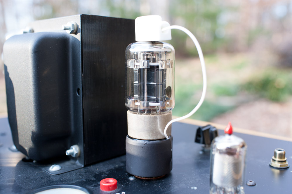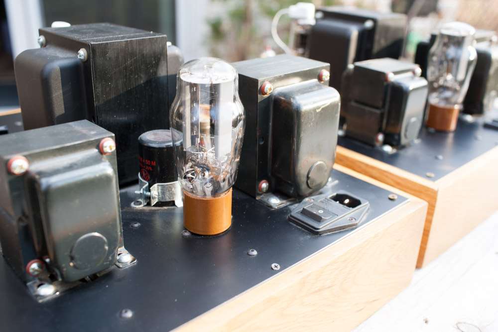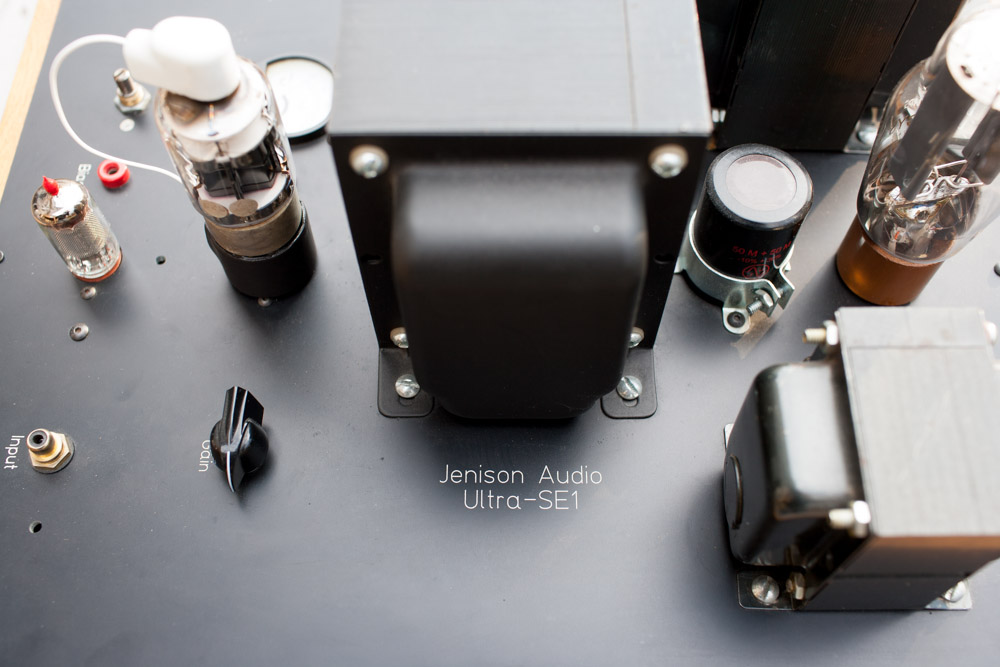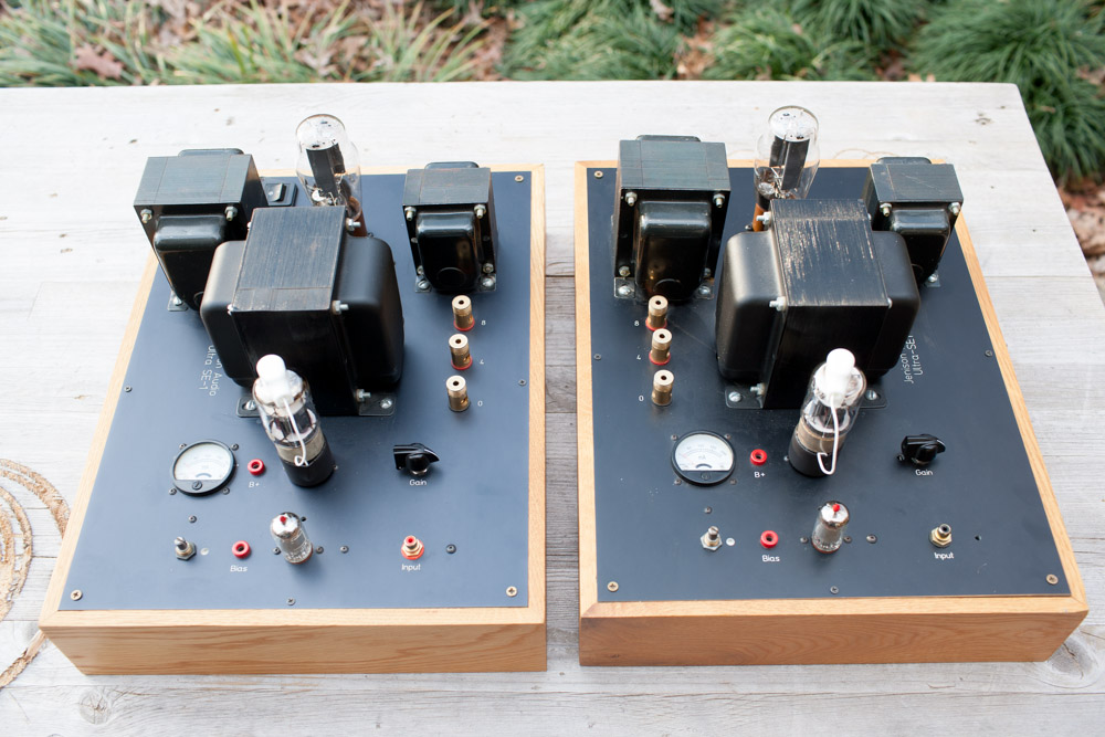 Jenison Audio Ultra SE1 The single ended monoblock amplifiers below are the work of Kevin Ballast, and are set up to use any 6L6/KT88/EL34 tube as the user wishes. Driven by a GEC EF86 pentode and rectified with a variety of choices from 5Y3 to 5AR4, these amps are a tube rollers dream come true. Details on this build, which was originally to run the EL156, are at Kevin's website 6th Street Bridge. So far, I’ve used these with KT88, EL34, and my favorite so far, the Bendix 6889. The Bendix tubes take a while to warm up, but once going they are very smooth and offer a big rich sound. The massive Hammond output transformers likely have something to do with that too. Overall, these have been a pleasure to use but take up a lot of real estate on my bench. |