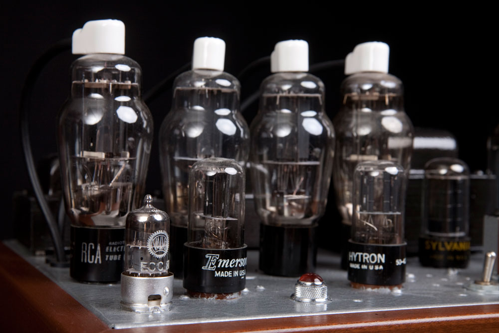 Two pairs of vintage RCA "beer bottle" 6BG6 power tubes. The nipple caps remind me of something that might be found in Frankenstein's laboratory. The tubes have a slight purplish glow when powered up. The input is a 12AU/AT7 family tube, and the 6SN7 are used as inverter drivers. I'm using NOS Hytron 6SN7 and a beautiful NOS Valvo 12AT7 here. |