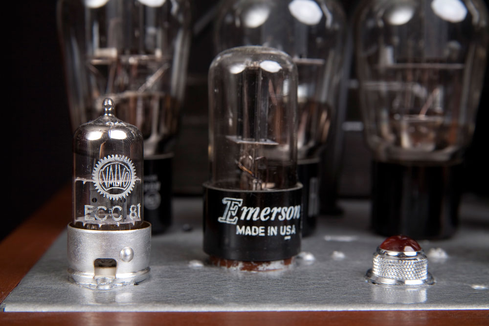 Jim supplied the amp with a nice RCA cleartop 12AU7 input tube, but after a bit of tube rolling I feel the Valvo 12AT7 is a much better tube in this amplifier. Right away the already large sound stage opened up even more, with great channel seperation. Maybe the best I have heard from a non-monoblock configuration. Gotta love the vintage pilot light too! |