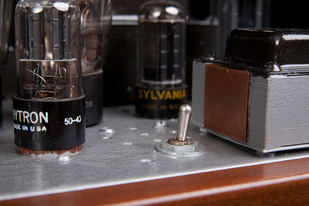 The vintage, heavy duty power switch is right up front. The copper banding on the choke is another nice aesthetic feature. |