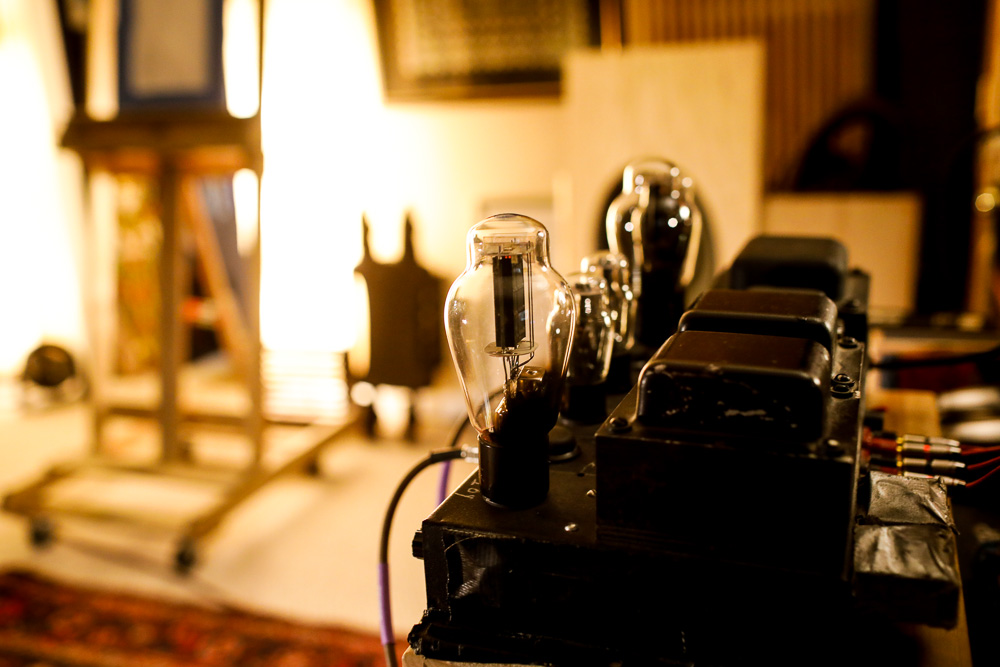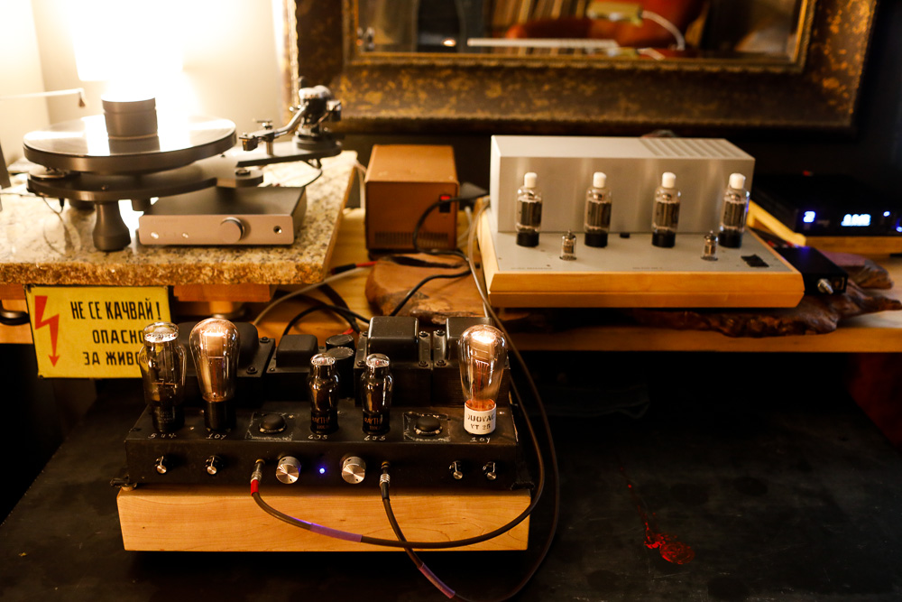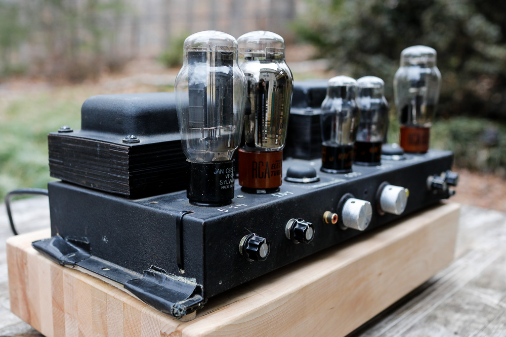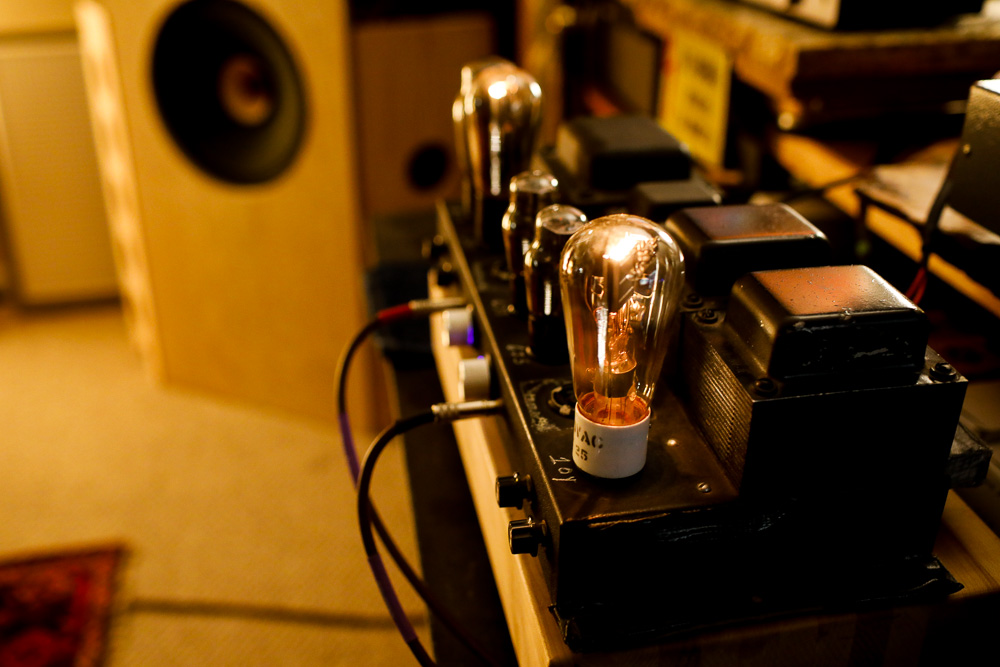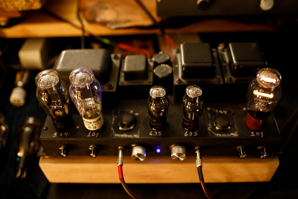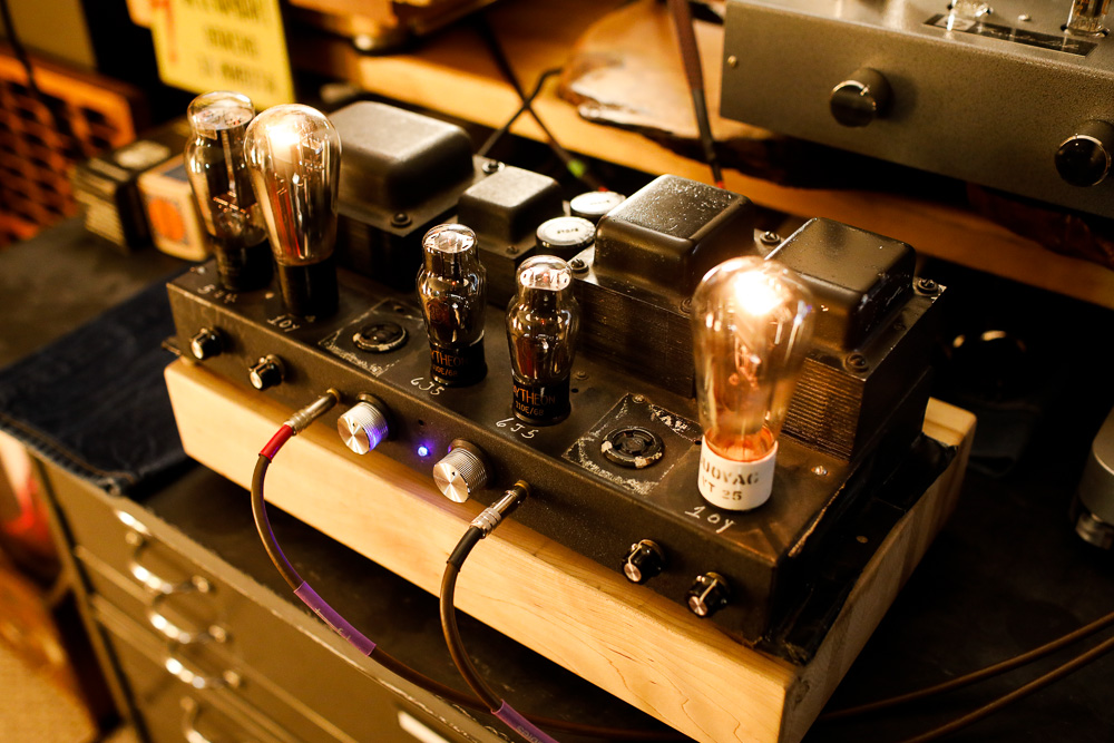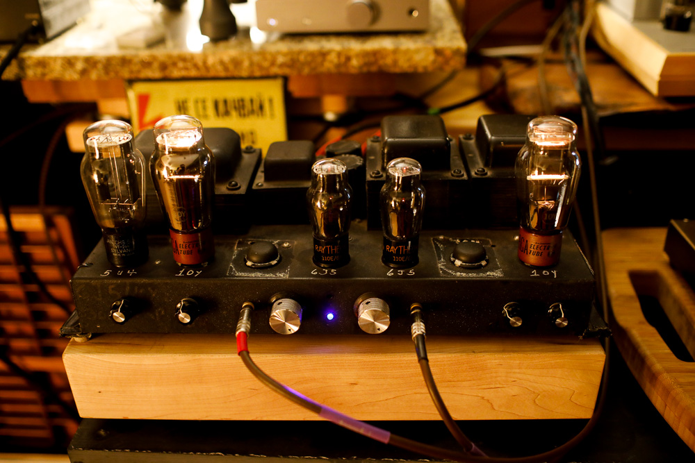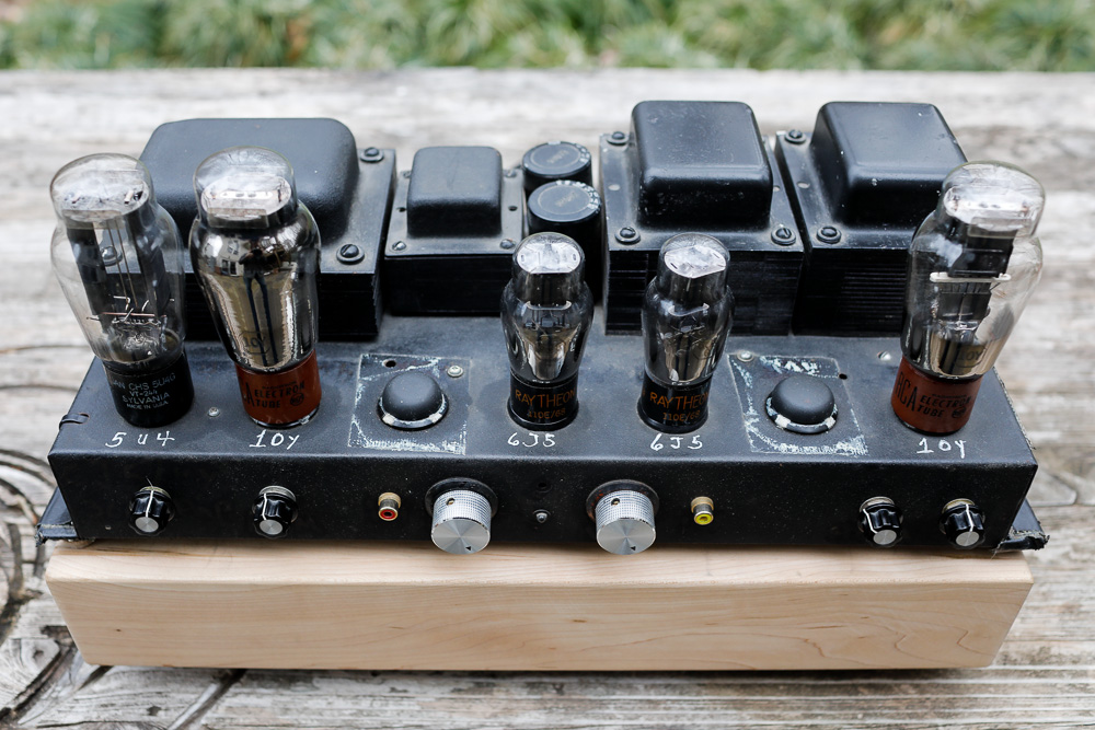 The 10Y driven by the 6J5 and rectified with a 5U4. The empty socket is covered here by a Sorbothane footer leftover from some project or other in the past. |