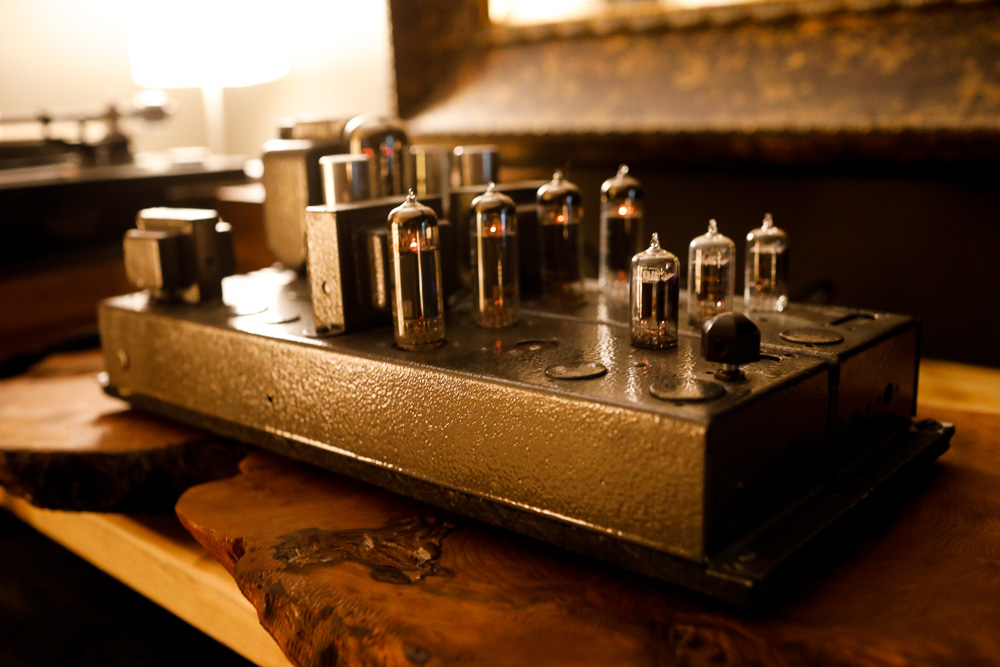 One of the nice things about Lance’s circuit is that any of the 12AU/AX/AT7 tubes (and their richly varied equivalents) can be used in the driver slot. Here I have a Mullard 12AU7 and a pair of Conn labeled Sylvania 12AU7s. Another great tube here was the Telefunken smooth plate 12AX7. A bit more drive than the Mullard, but the Mullard seems smoother. |