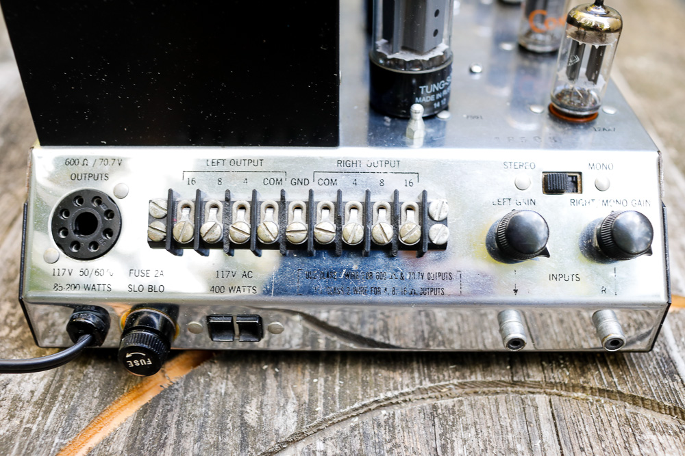 Like all the other 60's tube amps, the connectors are fairly minimal by modern standards, with the notable exception of quite robust and nicely spaced RCA inputs. The lettering here is still fairly intact, which is nice. These amps are switchable between stereo and mono output, making 50 watts as a mono amplifier. |
