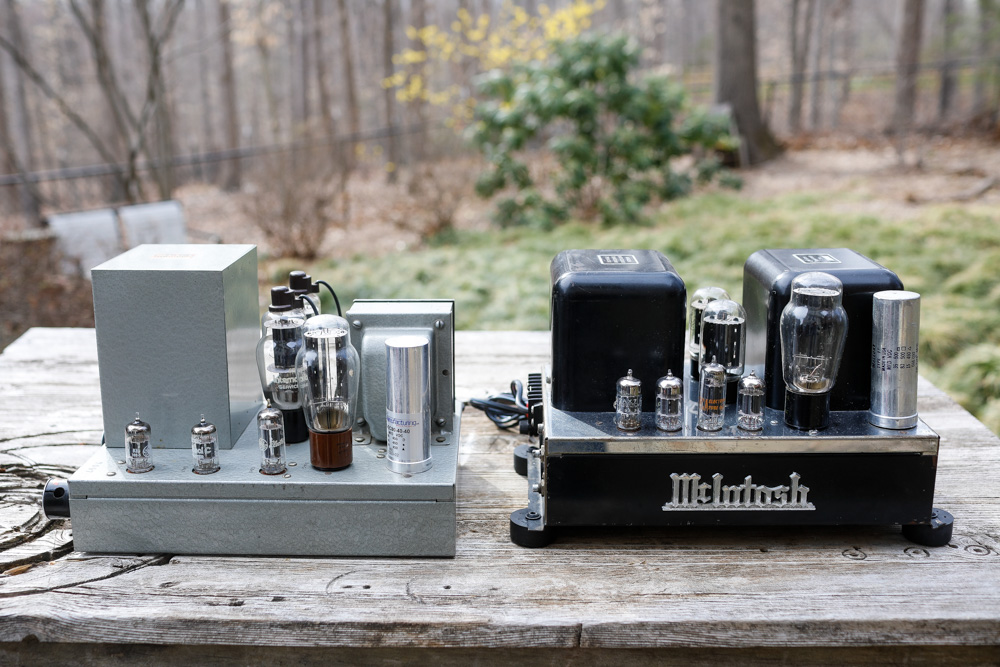 Here with its predecessor, the McIntosh A-116. The A-116 was the first McIntosh amp in a single chassis and seems to be a simpler design than the MC30. The A-116 predates the Unity Coupling that McIntosh is so famous for, and it uses the 6BG6 power tube rather than the 6L6; with both producing 30 watts per channel. Overall the A-116 profile seems to be a little lighter footed and more open feeling than the MC30. Both are superb performers! |