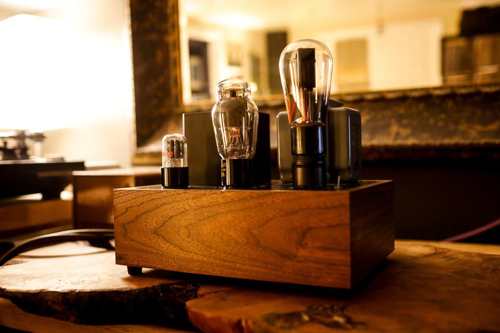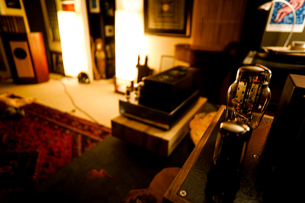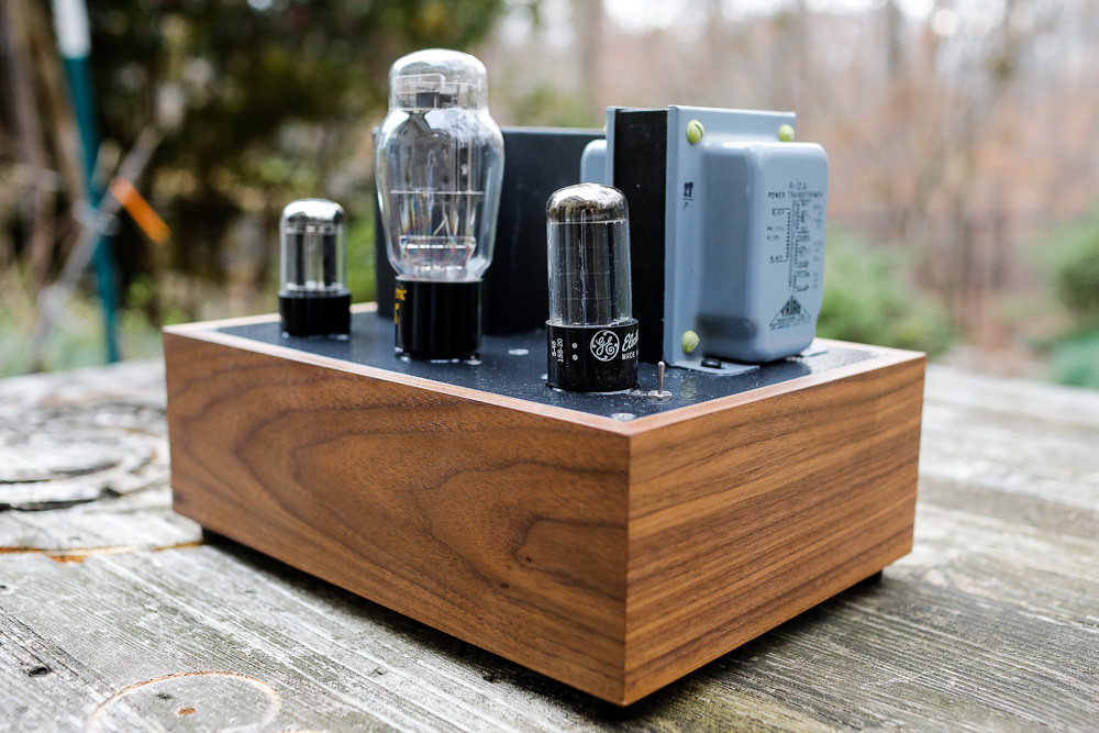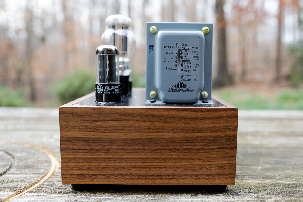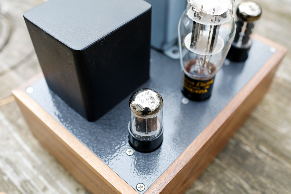 This amp is driven by the 5691 tube, an industrial version of the 6SL7. I’ve tried a number of 6SL7 and although I like the look of the traditional 6SL7 round plate tubes, the 5691 sounds just as good here. |