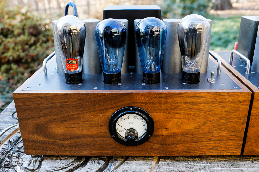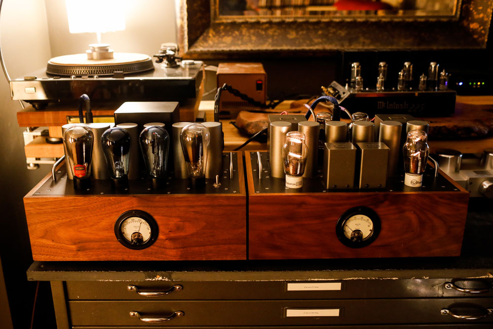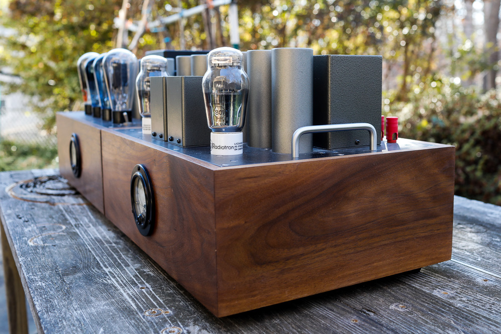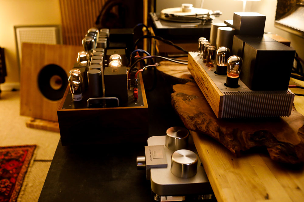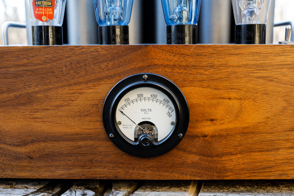 Both chassis feature Weston meters to monitor tube performance. Oliver likes to use pretty wood in his builds, and here is a clear example. Lovely honey tones and deeply pronounced grain. I love wood. I remember a quote from Eric Clapton about how in the future world “made from wood” will be exotic. Here is the hifi definition of exotic. |