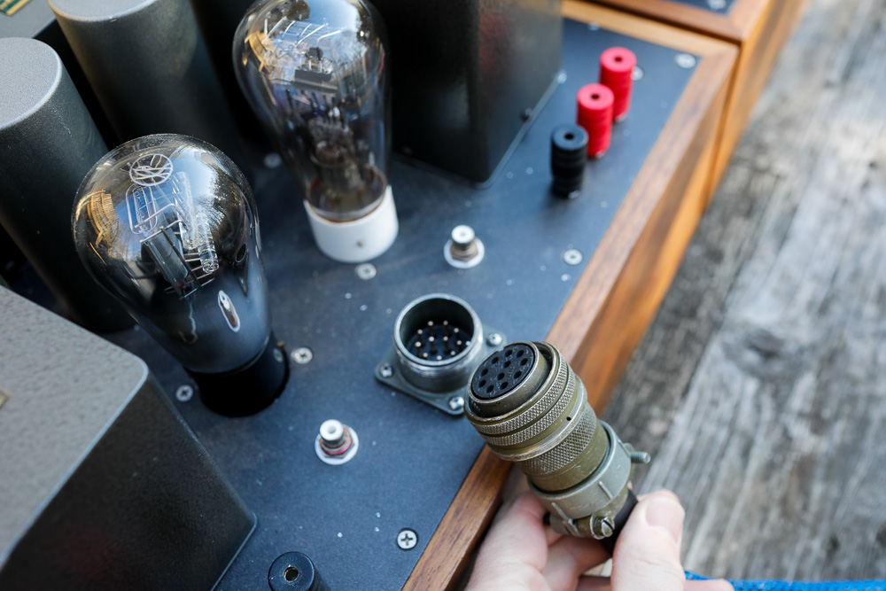 The power chassis and output chassis are connected by an umbilical with NOS Amphenol connectors, just like the Radu Tarta 71a amp that I owned in the past. This ensures that none of the power noise and dirt makes it in to the signal path, an elaborate but crucial step that elevates this amplifier beyond the mortal realm. As we all know power supply is crucial to a tube amplifier and this one has every advantage built in. These heavy duty connectors cost the military a pretty penny when they were built, probably in the 1960’s. The Pentagon spares no expense and these are beyond robust. |