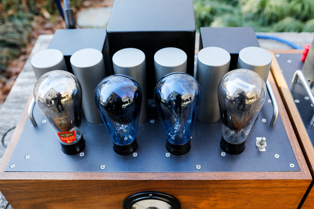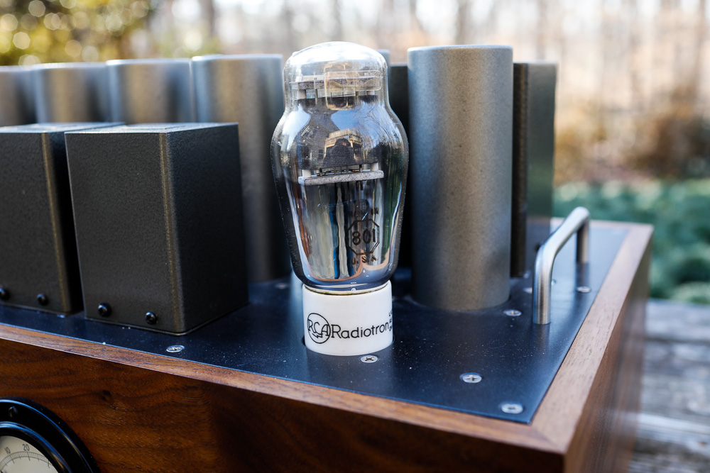 Here are the 801a output tubes, in this case very early 1930’s ceramic base RCA Radiotrons. These are probably the best sounding 801a tubes ever made. These are making around 3 watts per channel in this amplifier. |