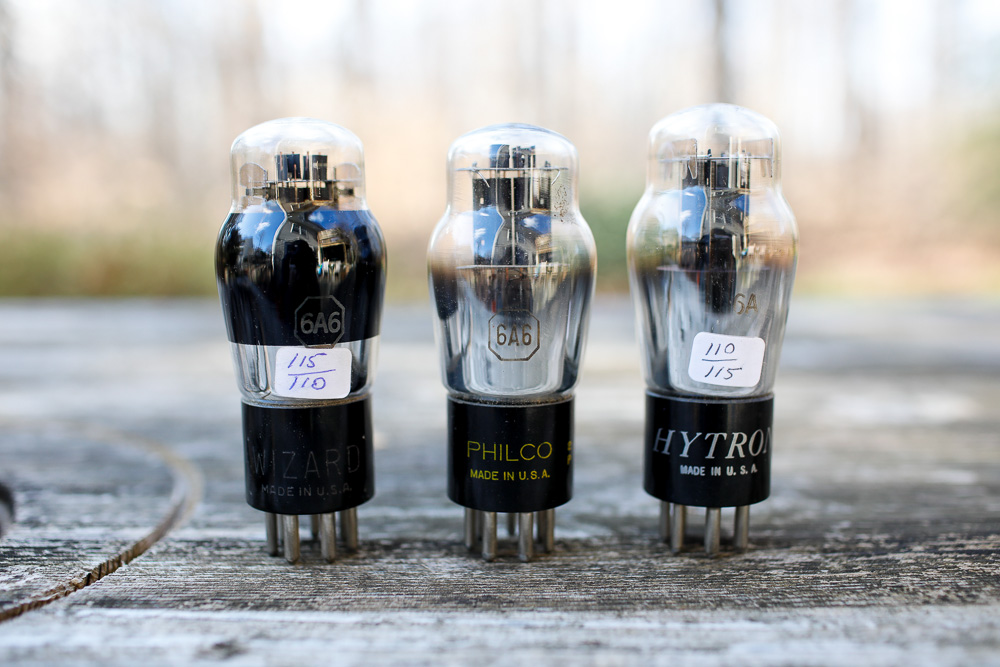 A selection of 1930’s 6A6 tubes. From left to right, a Wizard (great name!) smoked glass, a Philco and a Hytron. The Hytron has a twin flat plate construction while these others have twin round plates. |
