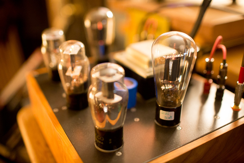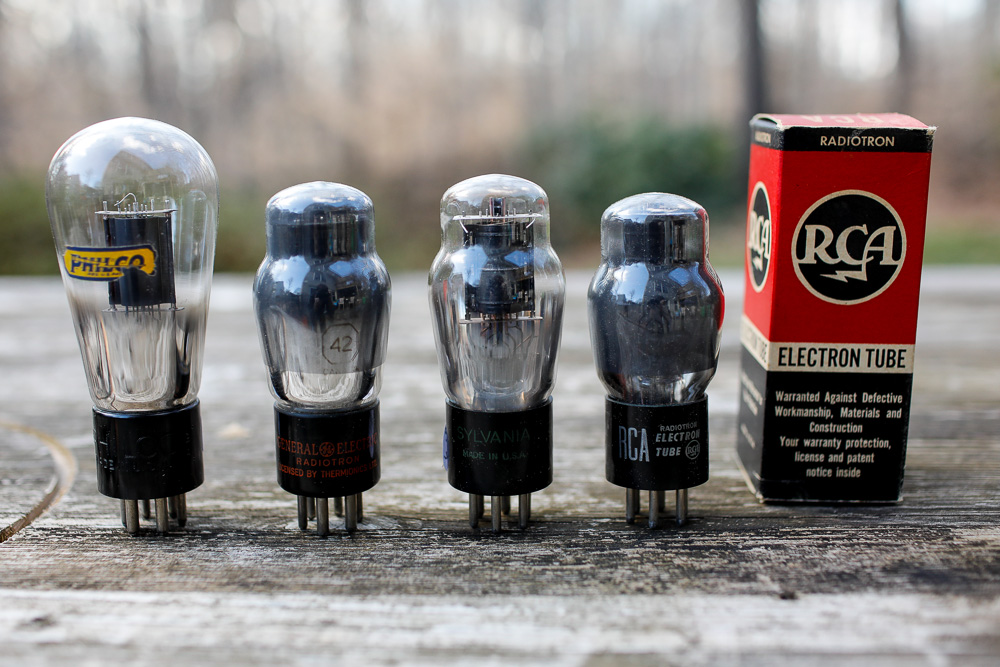 Four Type 42 tubes. The Philco globe is the earliest and sounds best to me (no surprise really). Philco seem to be the only globe shaped 42 I can find. All of them are nice tubes, and except for the globe they were all purchased new in their boxes for around $20 a pair! |
