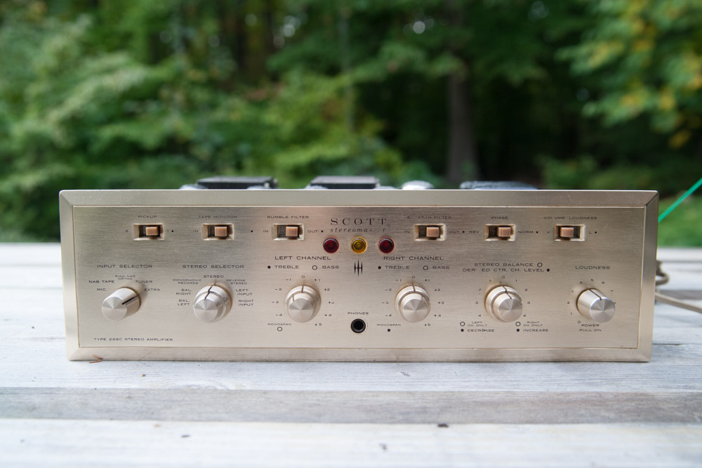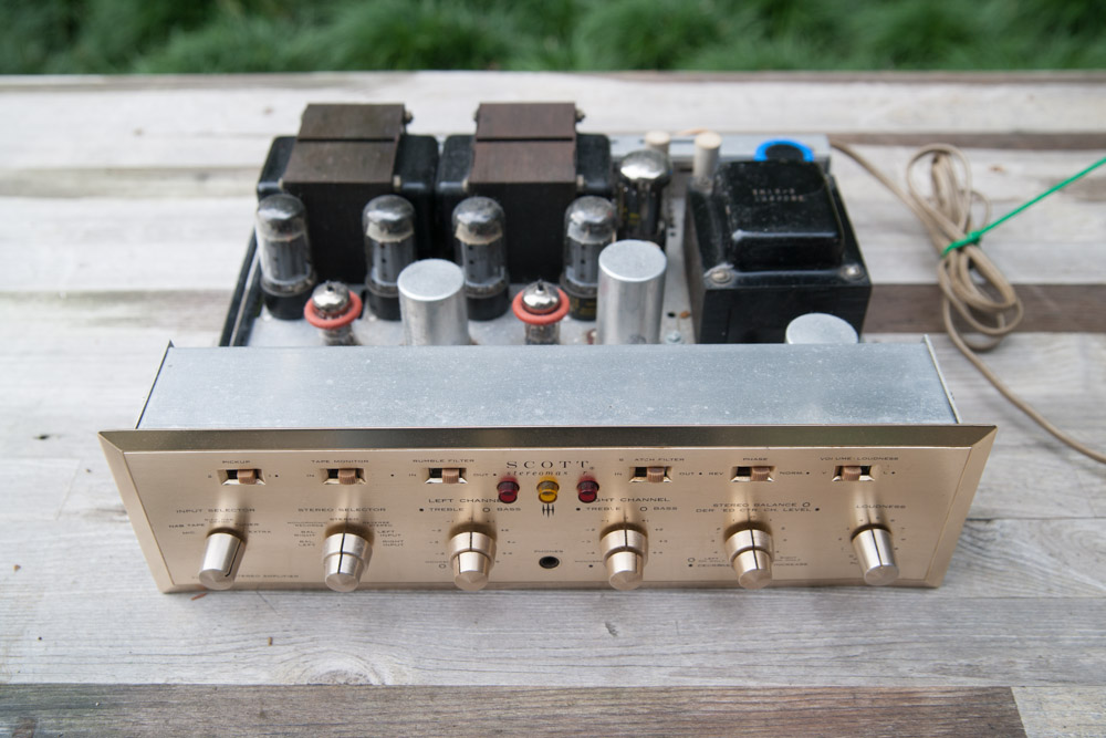 H.H. Scott 299C 1960's tube receiver Pictured below is a real audio classic from when the “golden age” of hifi was in full swing. The H.H. Scott 299C tube receiver is such a great piece of audio history. The amp below went through a complete restoration by Chris Keller. Featuring all original tubes including H.H. Scott power tubes, lovely Telefunkens throughout and a Mullard rectifier, it’s as nice of an example of a classic Scott amp as you are likely to find. This amplifier has such a rich tonality to its presentation that it really took me off guard. After hearing so many tube amplifiers over the years, this one has something so deep and rich about its sound that it really stands out. I used this receiver in my living room system for about a year, and while music was always enjoyable (but a bit less defined than the single ended amps that I’m used to), I found that paired with a Scott 350B tube tuner the voice reproduction was just stunning. Talk radio like NPR was just perfect, and even my teenage daughter liked the amp for her top 40 station. Sadly, sometimes I make a mistake and let a really fine piece of equipment go, and that is the case here. I bought the gigantic Mayer 45 and needed to make some of that back, and the Scott went out the door. Its one I do really regret letting go, and I hope the new owner is very happy with it. Maybe one day I’ll find another like it. Highly recommended. |