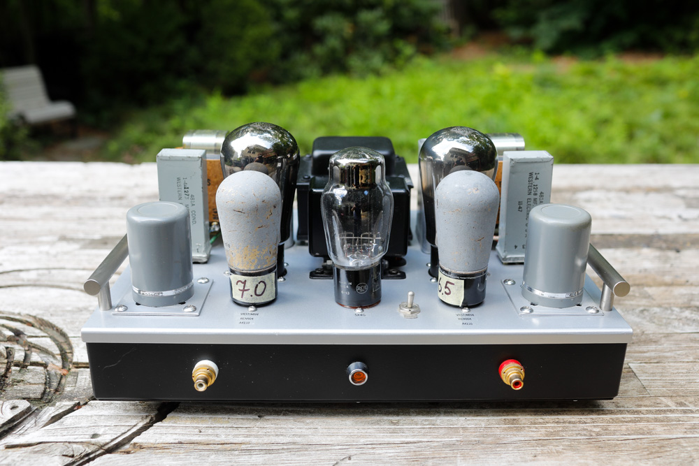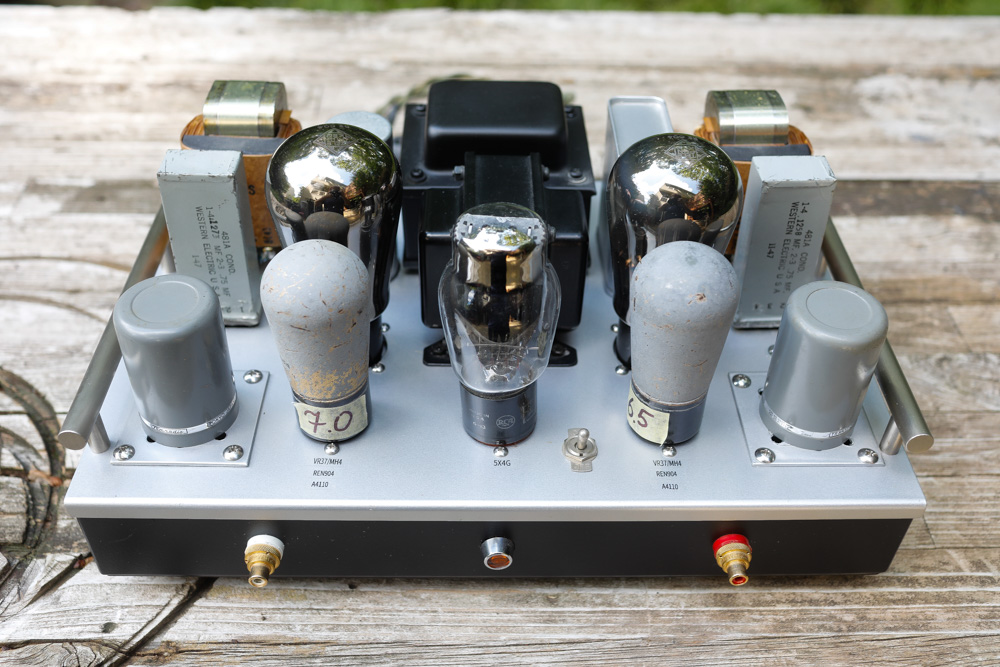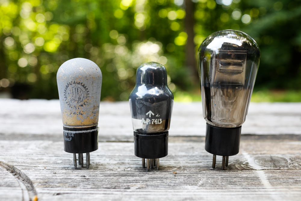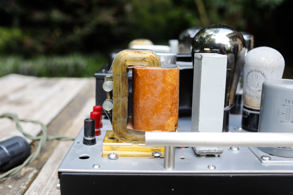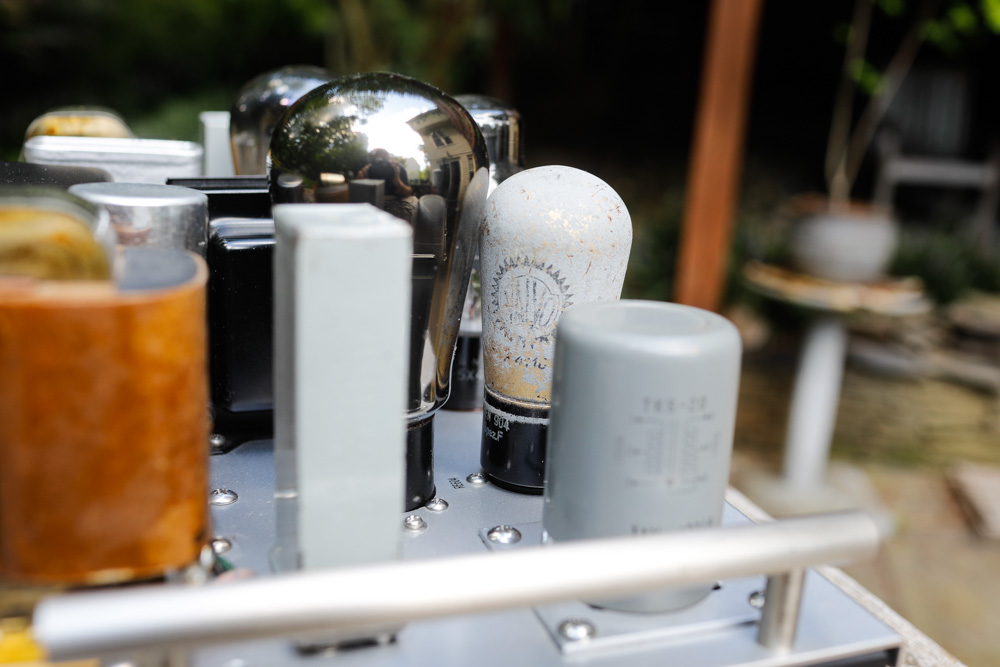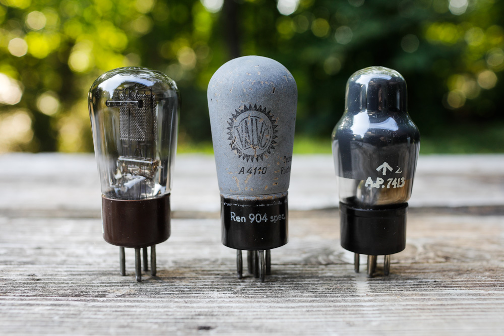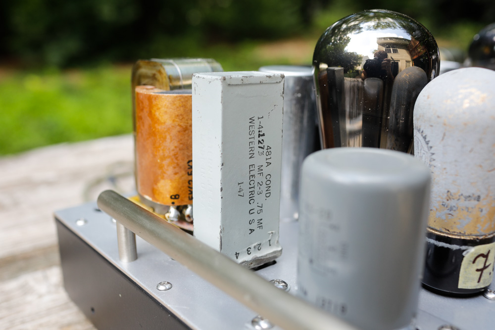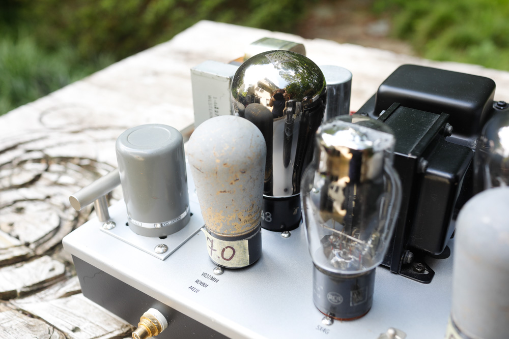 This amp uses a nice variety of input tubes. Here are: 1920’s mesh plate Philips E424, Valvo A4110 / REN904, and Mullard MH4. |