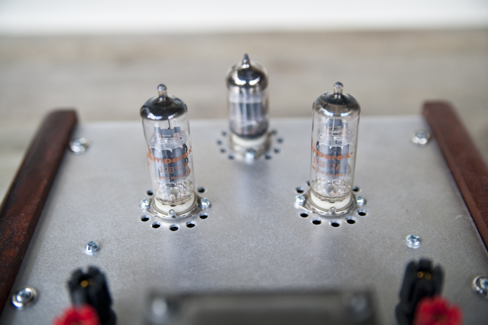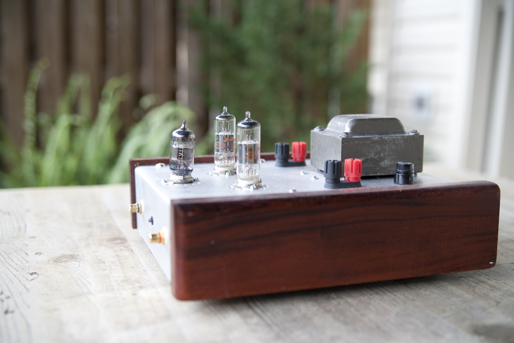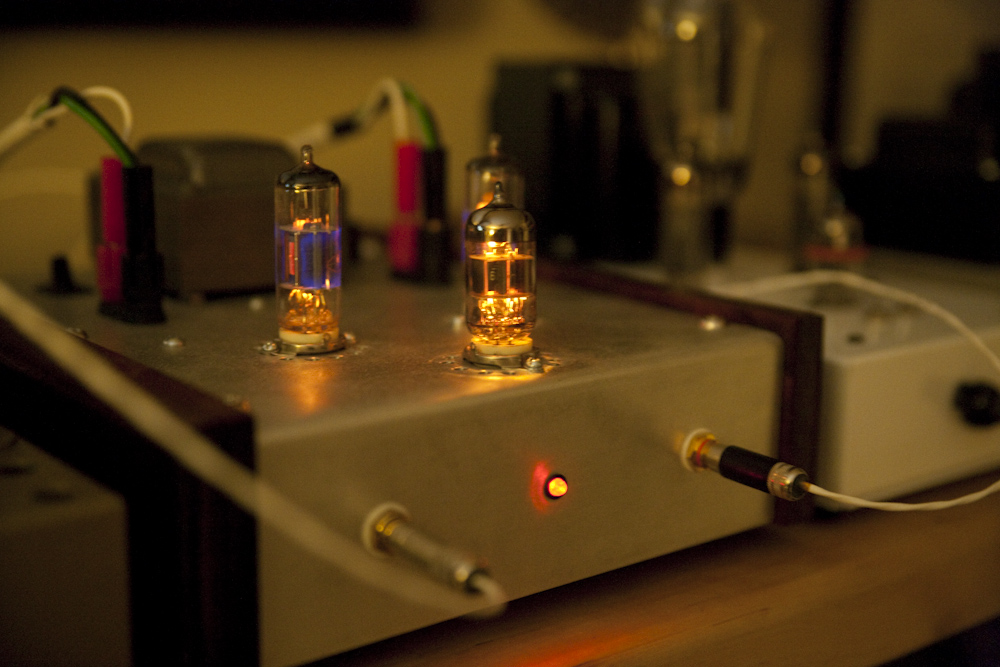 Classic Valve Design "Baby Amp S.E.P." Single Ended Pentode 12BY7A Here it is; this unassuming little single ended pentode is one of the best amps I've had in my room for imaging, tone and just plain musical enjoyment. Built by Gregg van der Sluys of Classic Valve Design in BC, Canada, the amp I am fortunate to own is apparently the first of three, and according to Gregg it is the best sounding of the trio. I believe it! I have no idea what's here parts wise, but the driver is a 6N1P and the output tubes are 12BY7A; a low cost and largely unknown tube in hifi. The 12BY7A seems to have been a video amplifier, and appears to have been used by HAM enthusiasts as preamplifier tubes. I sourced a 5 pack of NOS Orange Globe Amperex 12BY7A tubes for it at very reasonable cost, and it sounds spectacular! And the purple glow at startup is cool too! This amp has the drive, the deep rich bass and the floating holographic “you are there” feeling that really puts a smile on your face. Diana Krall and Tom Waits have rarely sounded this real and in the room. |