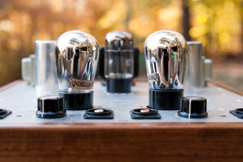 The creme de la creme of 1925–1926 audio: Here we have an array of 01a tubes; beginning with the RCA Radiotron UX201a, followed by the DeForest Audion 401a, and finally my personal favorite so far, the UX201a by Mello Tron. What a wonderful name! These are some of the very earliest triodes; and in fact this is among the earliest tube ever marketed by RCA. Apparently the taller base denotes an earlier tube, so the RCA and Mello Tron likely date to '25 or '26. The DeForest tube features a wonderfully artful engraved base. Cool stuff! |