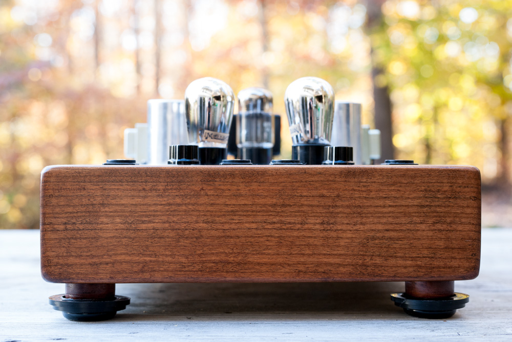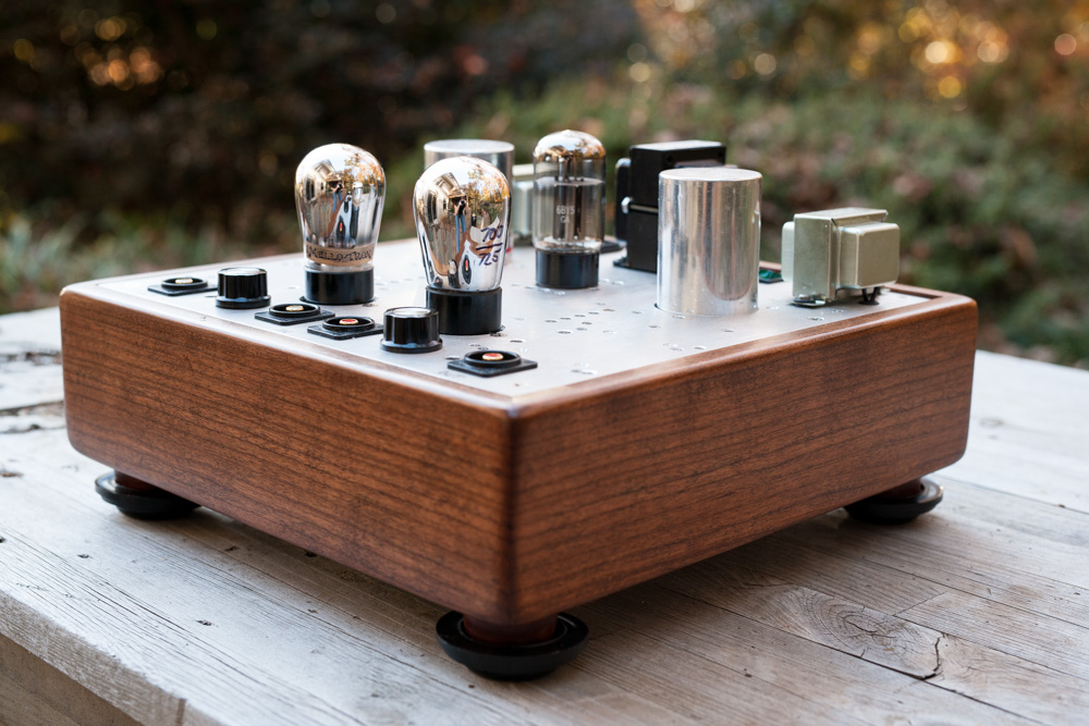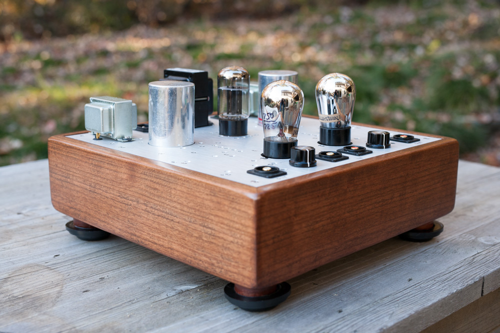 Because of the extreme microphonics associated with the UX201a, some sort of isolation is essential with these tubes. Here I'm using foot damers to protect the amplifier from surface shocks. Believe it or not this makes a marked improvement with the UX201a tube. |