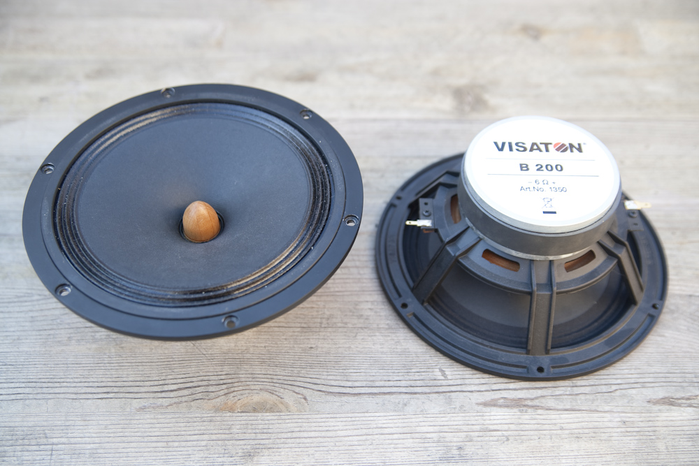 Visaton B200 The Visaton B200 started my journey into DIY full range speakers. Before the Visaton, I owned a very early Tekton 3 piece subwoofer speaker set with 4 inch Fostex drivers, and then a small open baffle loaded with 8 inch Fostex fe206 drivers. After reading through 50 or more pages of a now legendary thread on Audiocircle called the “Gravity Well of a DarkStar,” I ordered a pair of Visaton B200, bought a jigsaw, and made my first circle cuts onto wood panels. After mounting the drivers and hooking them up to my Decware monoblocks, I was completely blown away by the sound quality of these well made 8 inch German drivers. How much simpler could it be than this? I couldn't believe the sound these produced, and my itch for DIY speakers was born. The Visaton eventualy moved on, but their success led to a seemingly endless progression of one or another driver; Lowther, Supravox, Norelco, Coral, ElectroVoice, etc. Almost 20 years later I found another well used pair of Visaton for sale and bought them again, to sort of take a pulse and see what the first great driver I owned still has to offer. And I am here to say that I started with a winner. In many ways the Visaton B200 is the ideal wide band OB speaker driver, and mounted in the Telefunken cabinets these drivers could easily be an end game setup. Sometimes you don't know how good you had it until its gone, and I am so happy to have these beautiful drivers back in my life. The Visaton B200 are 6ohm fullrange drivers, made in Germany, and are optimized for large volume or open panel speakers. They make prodigious, room vibrating palpable bass on OB, and they play high enough for my hearing without need of a whizzer cone and its distortions. These are solid, well made drivers that deliver the goods with a minimum of BS, and at 96 db/wm they dance well with the little amps that I love. 1 watt will energize the B200 to room filling, neighbor complaining sound levels. 45 watts is no problem either, these are not fragile drivers, and they really get up and boogie with some power applied. In my Telefunken cabinets (which I didn't own the first time around), these are an ideal solution, and perhaps the best the Telefunken have ever sounded to me. |